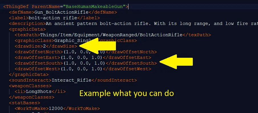 [b]- Your mod doesn't break if you remove or forget to activate Enable Oversized Weapons:[/b] All you did was modify the already existing graphicData which vanilla Rimworld has, but ignores. There will be no errors. Worst case if you remove the mod: your weapons are now as tiny as vanilla Rimworld would render them. If a new Rimworld version would come (1.4 for example), you can even update your weapon mods without this mod being updated, because you are not depending on any code. This gives you the possibility to start updating from day one.