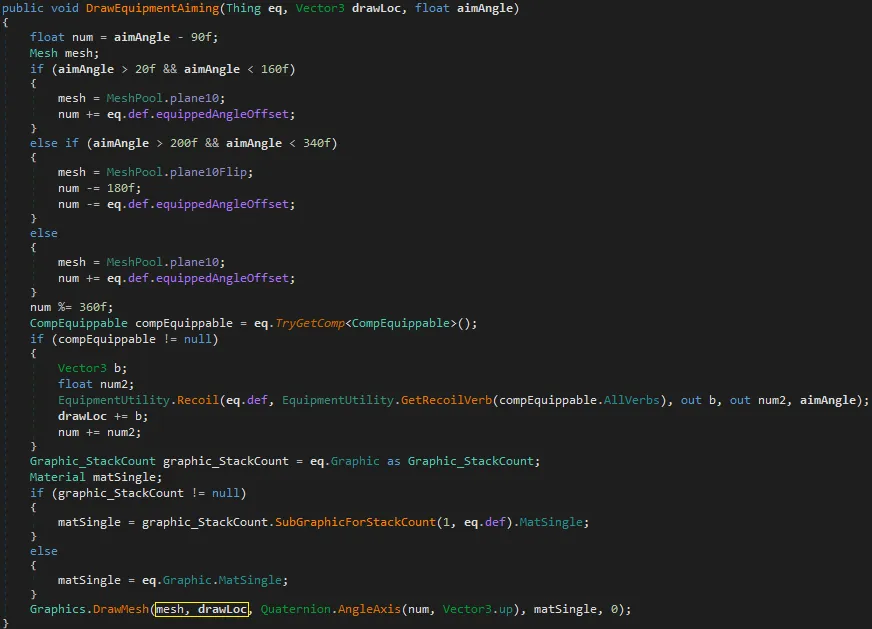 - Rimworld now throws a config error if the weapon has offsets. This is harmless but annoying. It can be circumvented with setting "rotatable" to "true" in the weapon def, but i don't know what impact this has on other things the game does with weapon rendering.