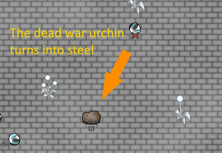 When war uchins die, 7-12 pieces of steel will be dropped,leaving no body behind.当机械死卫死亡时,会掉落7-12个钢铁,不留尸体。