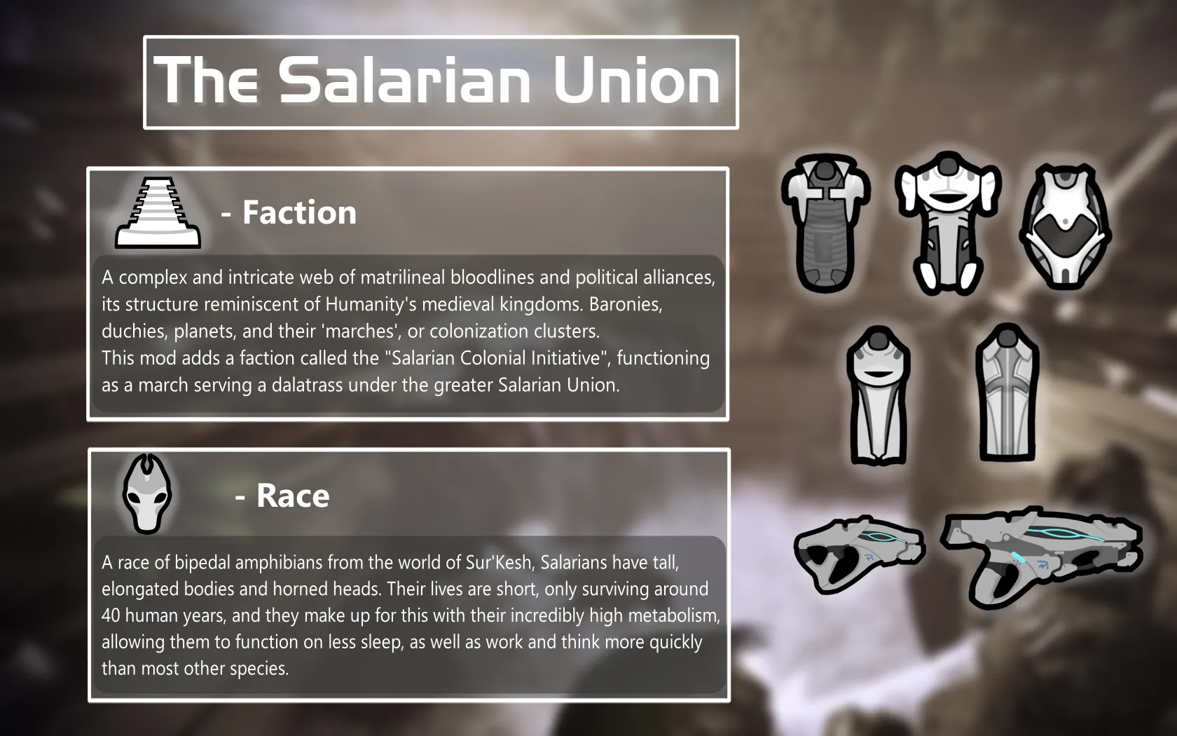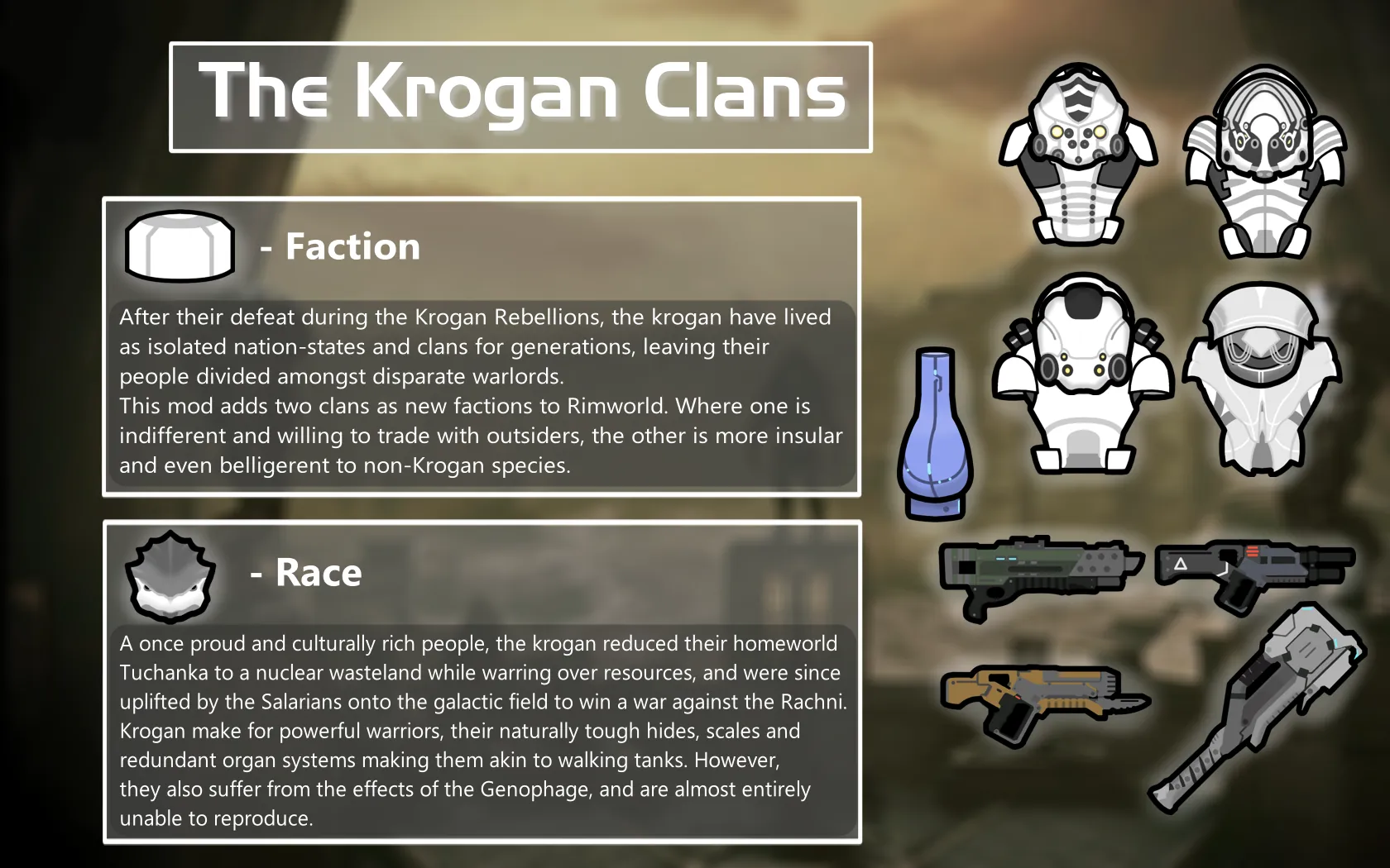 The second entry into a series of Mass Effect themed mods that I intend to make, in order to bring that universe into Rimworld bit by bit to the best of my ability. This mod adds two new races, as well as their own weapons, armor, factions and more.