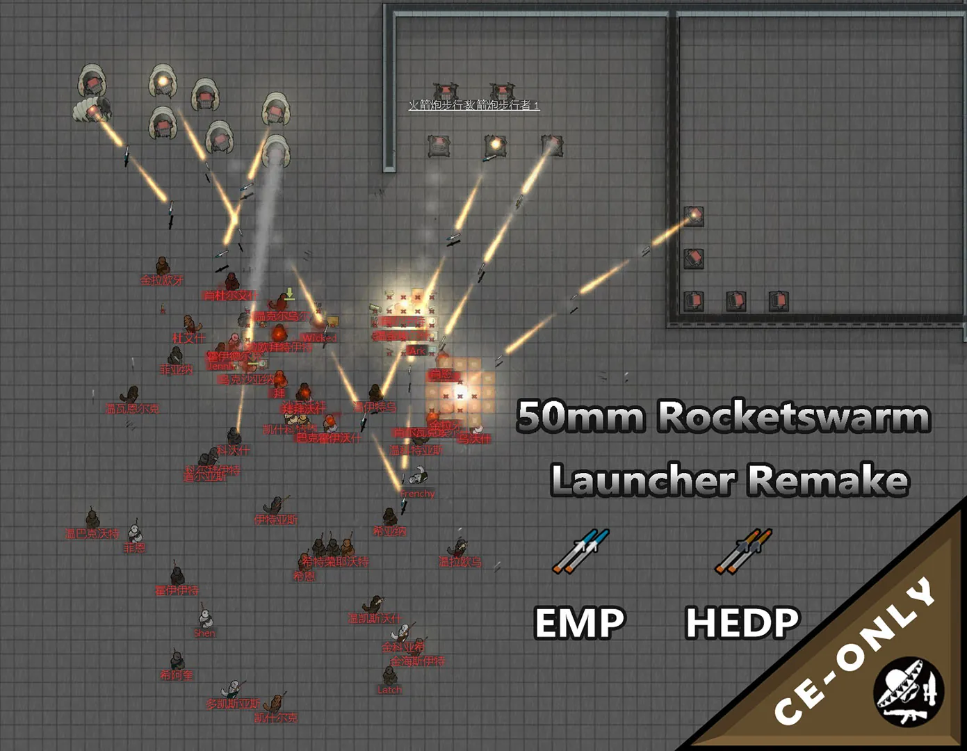 Remaked the 50mm Rocketswarm Launcher in CE. Its firing method has been changed from indirect fire to direct fire capability. Two new specialized ammunition types have been added: EMP and HEDP , specifically developed to counter large-scale Mechanoid threats.