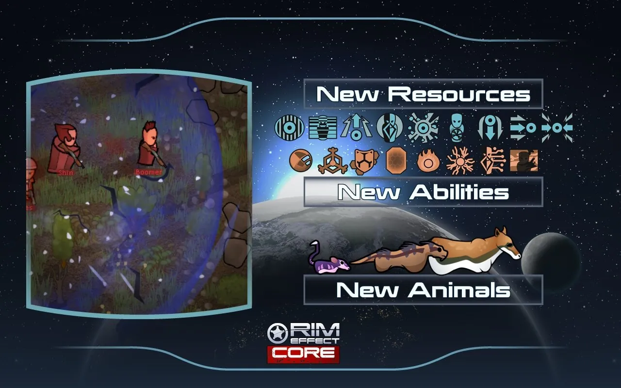 Rim Effect Core is the primary module for this mod series, upon which all other sub-modules will depend. Core module introduces a brand new ultratech faction - Systems Alliance, with their own planet-side bases, apparel, weapons, backstories and structures. It’s certainly the biggest mod ever made by us, and potentially the biggest mod on the workshop right now, featuring dozens of new structures, multiple new power sources, an in-depth ability system with tech and biotic powers, lots of new weapons, apparel, animals and other unique mechanics.