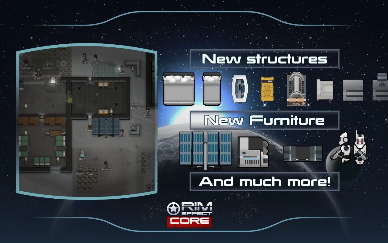 Rim Effect is a large overhaul mod series, adding the story, races, objects, and conflicts of Mass Effect universe into RimWorld. The Mass Effect elements are not meant to stand out, and as such are blended into the RimWorld style by utilising the same naming conventions and writing styles.