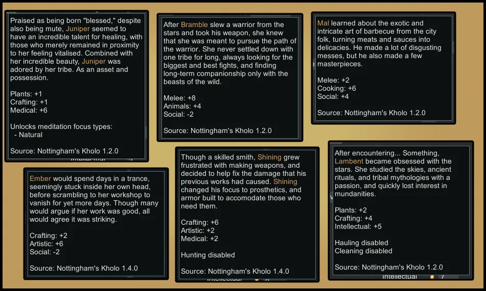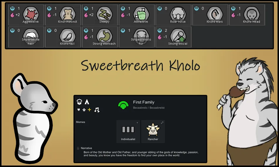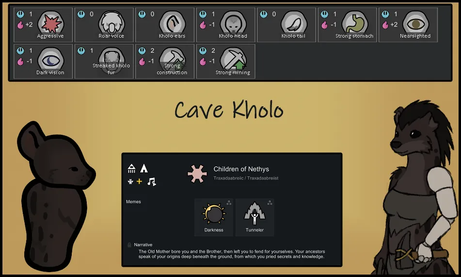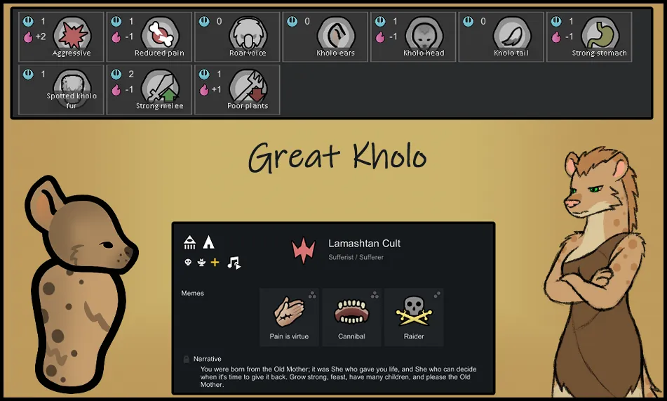 Includes several new genes (adding new heads, bodies, sets of ears, and a tail), three new xenotypes (Great Kholo, Sweetbreath Kholo, and Cave Kholo) with a faction each, several new adult and child tribal backstories, one new trait attached to a backstory, and wild hyenas of both the spotted and striped variety!