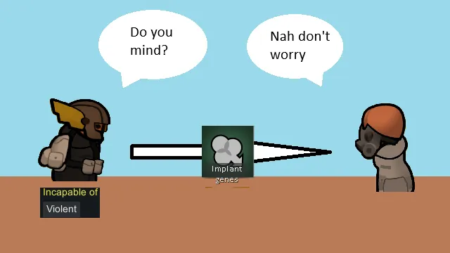 I was playing my colony and found it ridiculous that my pawn that was incapable of violence could not implant there genome, as I felt that was a non-violent activity, so I spent the next 4 days learning how to mod and patch this issue. This patch is not the most efficient, but it works.