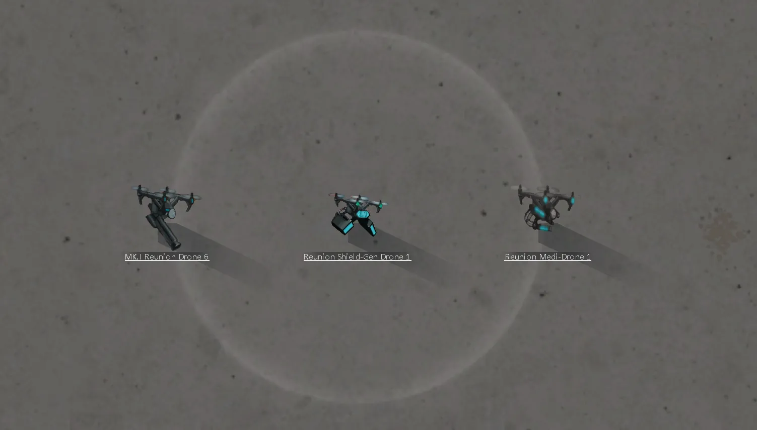 -Reunion Shield-Gen Drone, Drone that projects a lowshield around itself to protect those in the perimeter of the dome, this drone is unlocked after completing the standard mechtech research and can be crafted at a mech gestator. Costs 1 bandwidth.