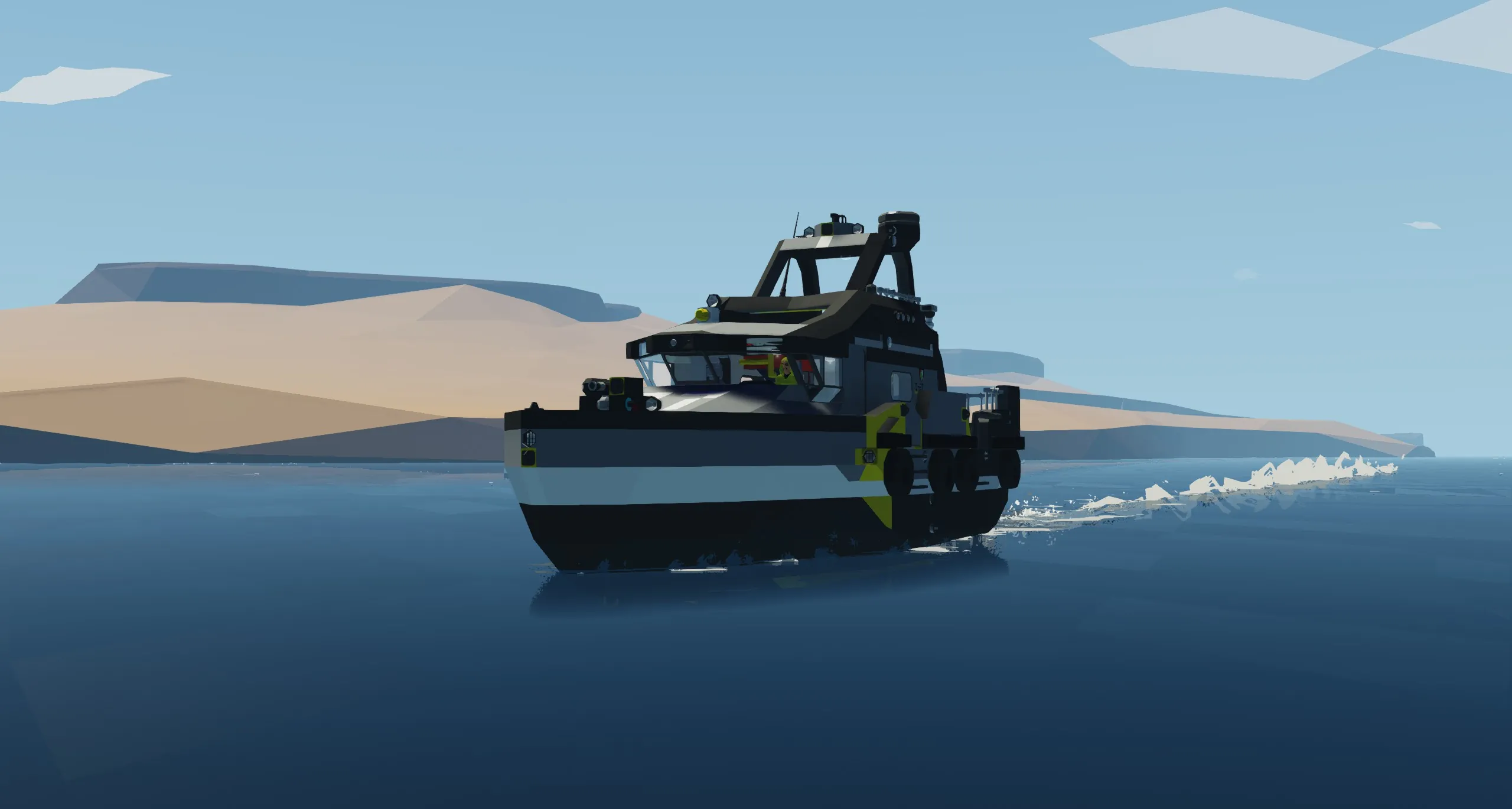 这艘船有一个2AT动力系统。发动机功率设定了额定的4个数值由上/下按钮控制,螺旋桨桨距由W/S按钮控制。一个可以超控的发电系统。