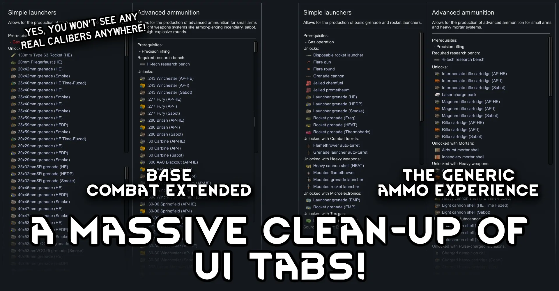 Have you ever been annoyed about real ammo appearing under research projects even with the generic ammo setting turned on? Me too, that's why - using a patch over a thousand lines long - I've removed all non-generic ammo from the research tab, the stockpile tab, etc.