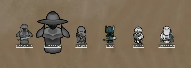 Inspired by classic fictional media of suits of armor that "come to life," Mechcloud Chemwalkers is a race mod that allows for the creation and domination of suits of armor that have been seized and animated by mechanites. These so called Mechclouds inhabit the hollow suits and give them the ability to be autonomous. In order to maintain control and have sufficient energy to act, these clouds consume chemfuel.