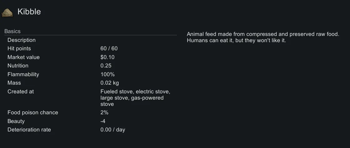 Better Kibble aims to be an all-in-one improvement to vanilla kibble and aspects relating to its usage, storage, and crafting. This mod is designed to enhance the gameplay experience for RimWorld players who utilize kibble as a primary source of nutrition for their animals.