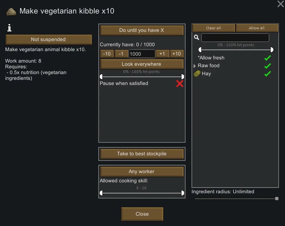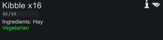 [*] Adds vegetarian kibble recipes in 10x and 100x quantities, including crafting kibble with only hay.