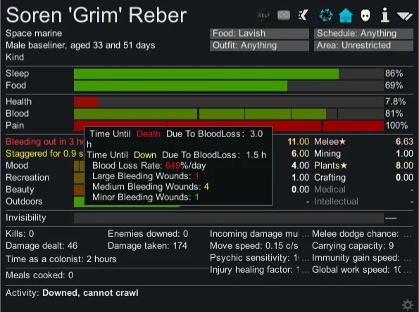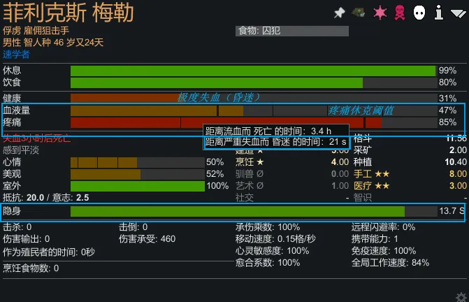 The thicker divider line on the Pain Level bar represents the character’s pain shock threshold. (This bold line is created by stacking three closely spaced thresholds, so minor display issues may occur if the bar is too long (?))