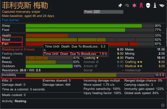疼痛值(阈值线:有关休息工作分配的30% - 疼痛休克阈值。tooltip:实际疼痛值<即不限制最大100%的实际伤口疼痛总和> - 疼痛休克阈值)