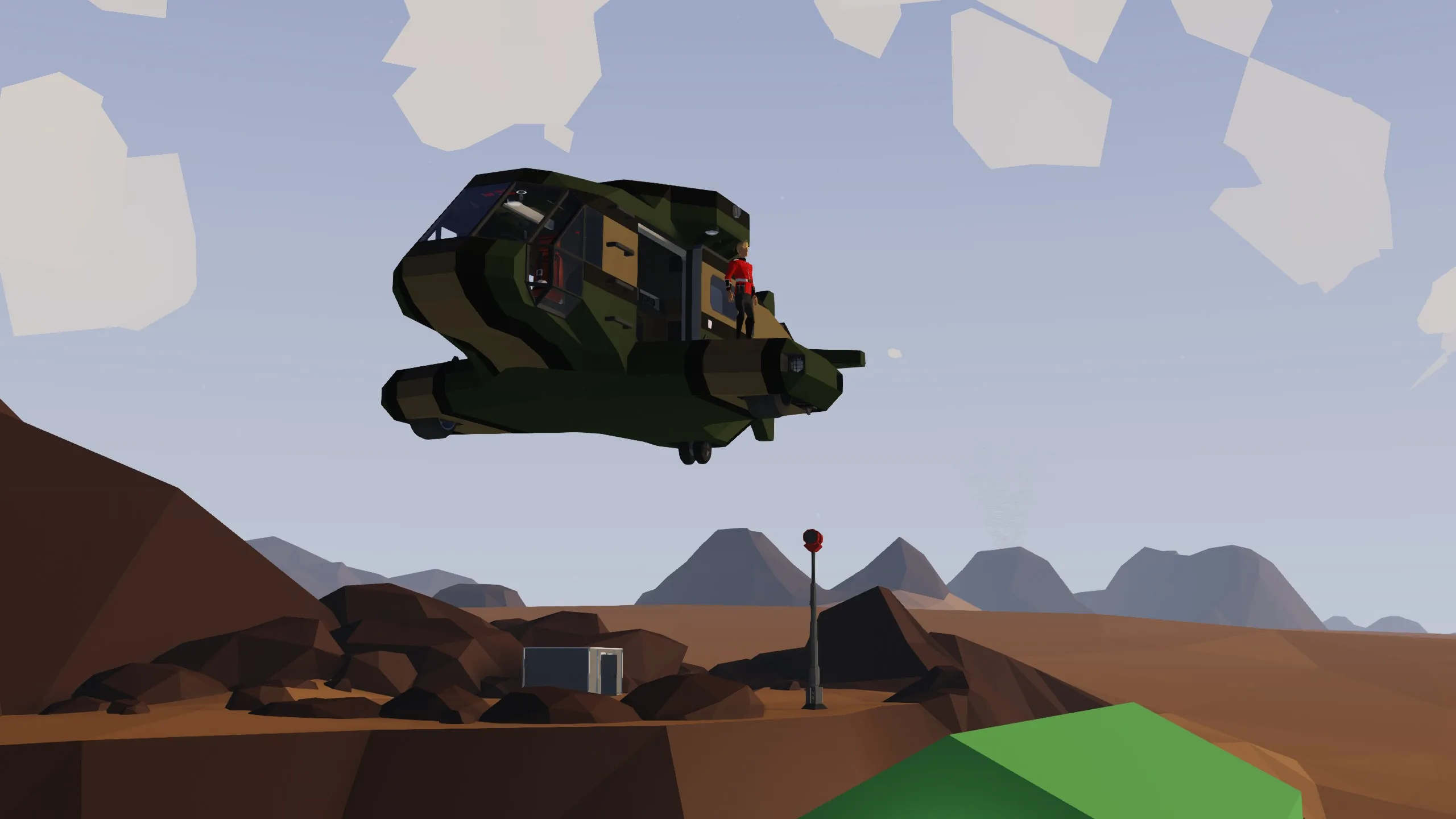 The copter has good buoyancy, and is safe to land in the ocean even in high waves. The sliding doors can have trouble opening and closing in unstable conditions, but the hatch above the cockpit is easily reached by ladders on both sides, and is of course safe to get to because the lift rotors are completely enclosed.