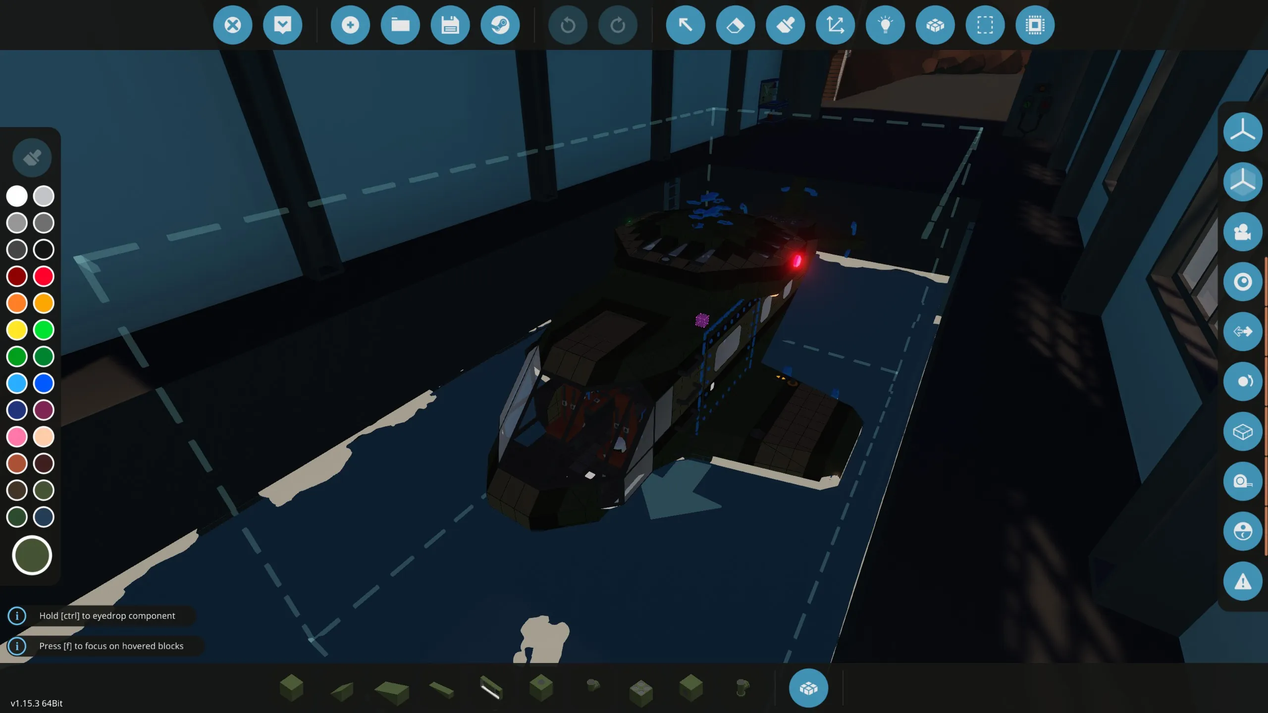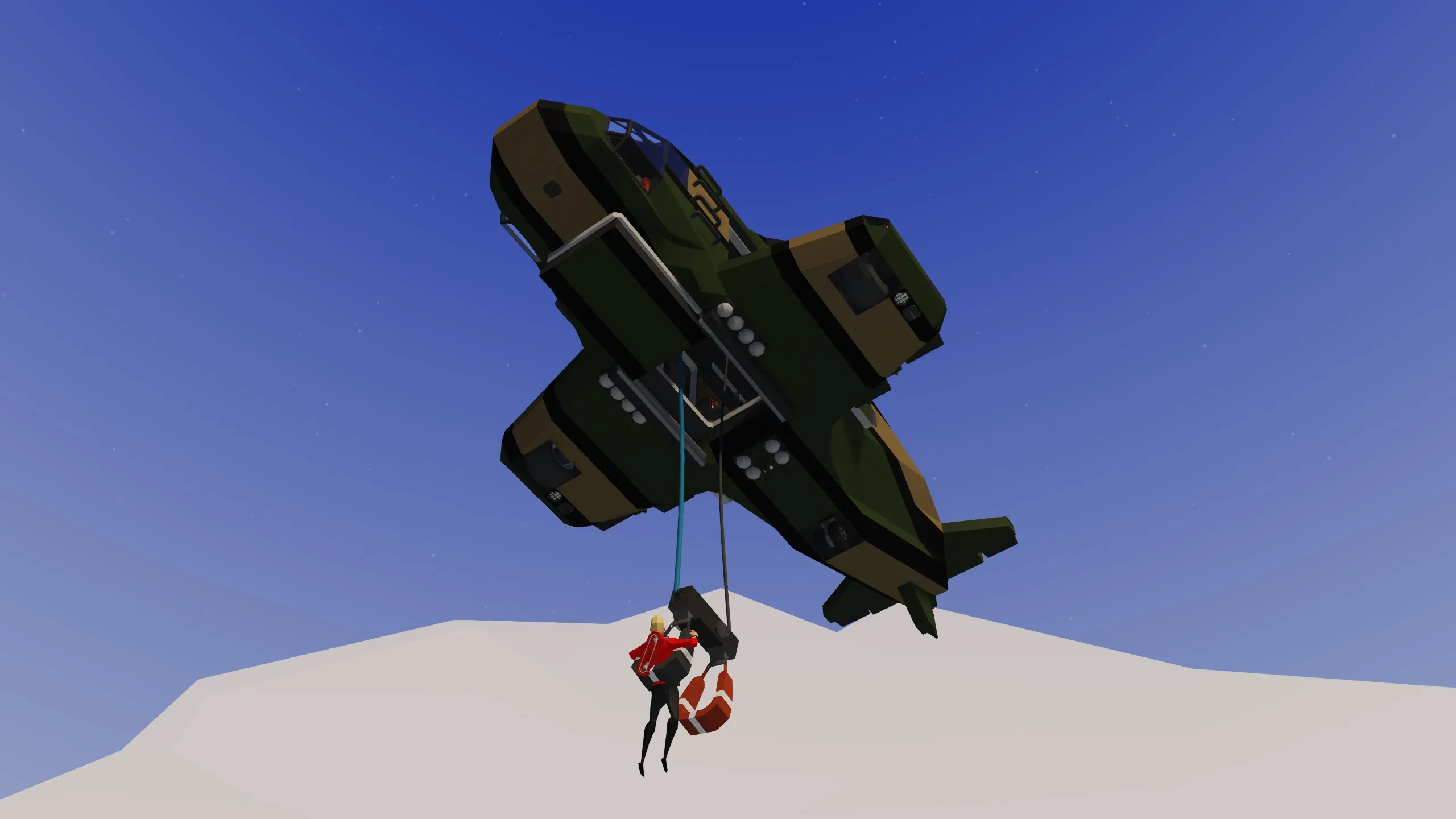 I added mags and a hardpoint, and a big floor hatch for a pair of harnesses. I usually prefer to put the landing hardpoint under the nose, so it is easy to spatially estimate its position from first person, but because the floor hatch slides forward that didn't work out. Instead, it's aft of the hatch, very near the middle of the aircraft. So, from first person I think simply locking on with the mags is the more sensible option. The mags and hardpoint are both controlled by foot buttons in front of the copilot seat. The floor hatch and winches can only be opened from the black "Control" harness, the orange harness is passenger only. The harnesses have a light and a mag all on the bar in between them, also controlled by the black harness. I'm unsure how useful that mag all will be in this configuration, but it's been useful on my other little vtol.