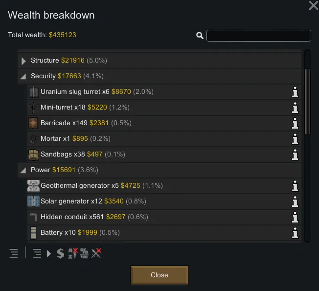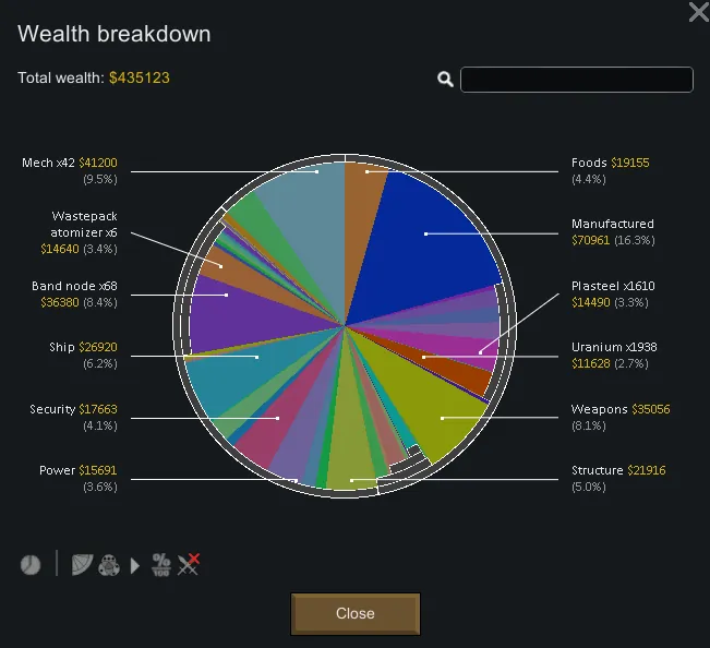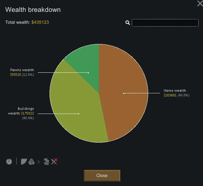 Did you know that your thrumbofur stockpile makes up a massive portion of your colony's wealth? Did you know that your snowhare corpse is worth $18? Well now you can see a detailed breakdown of your colony's wealth, including all your items, buildings, and pawns.