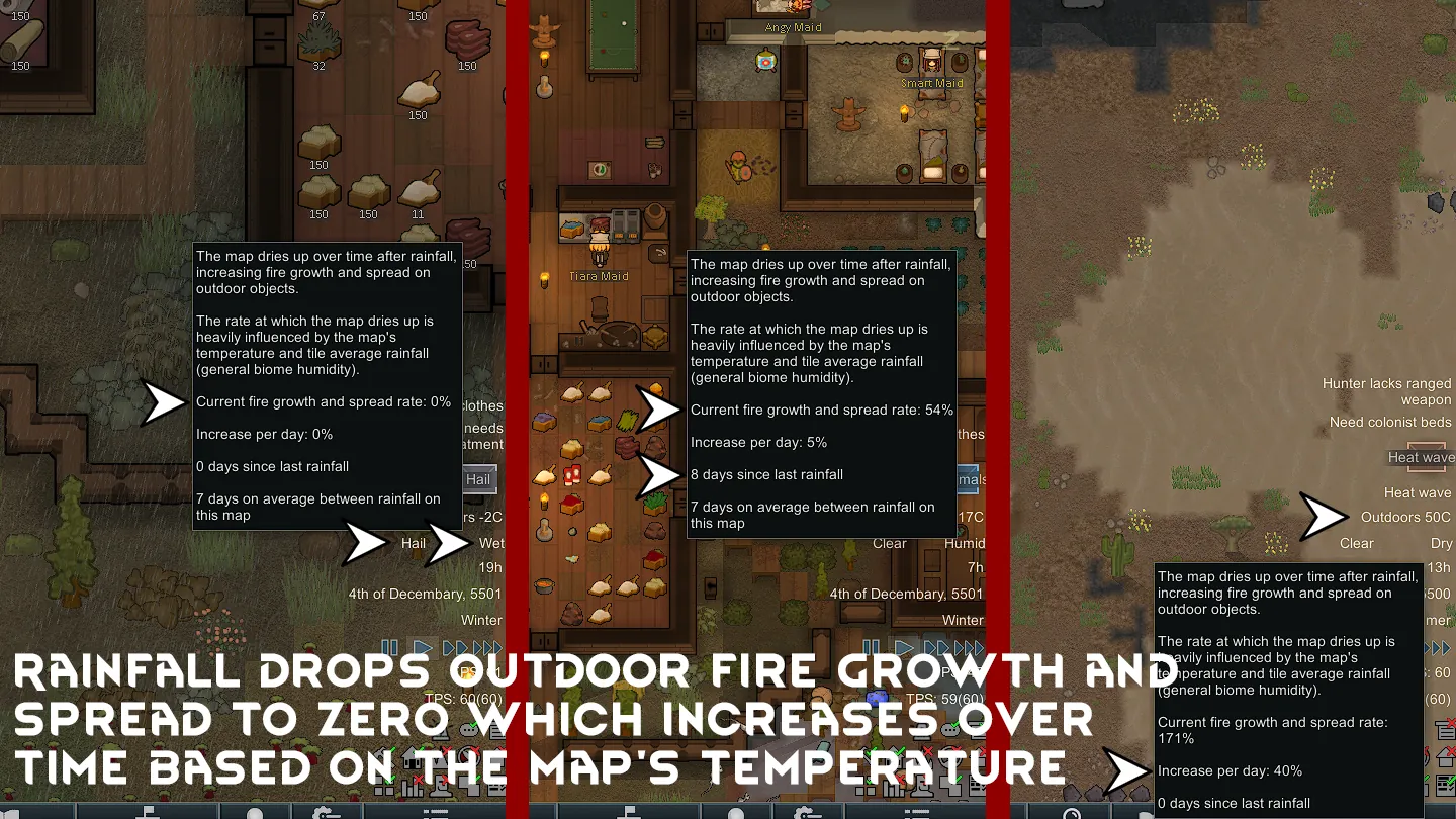 Jungle and swamp biomes will behave more realistically, no longer igniting into massive forest fires due to their high rainfall. While boreal, tundra, and the ice caps will behave more realistically too, where the low temperature means the wetness stays high despite low rainfall. But watch out if it's a scorching hot desert during a heat wave! (Evaporation rate adjustable in the options).