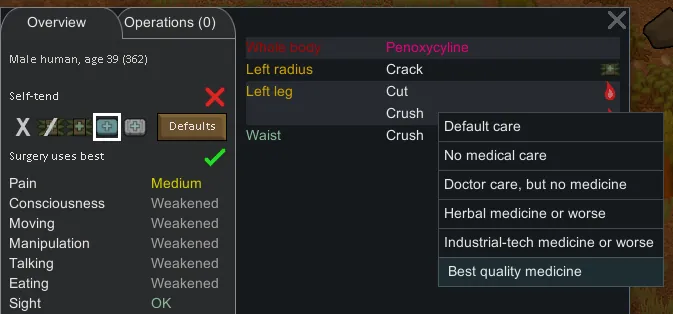 [b]Custom Care[/b] for each injury - right click the injury in the list to set what medicine to use on it. Keep in mind wounds are tended in batches so setting it lower is not saying "never use better", it's more "don't bother with better for lil' old me - but if something else needs it, I'll take it too" (Also note, this effect is not saved after loading)