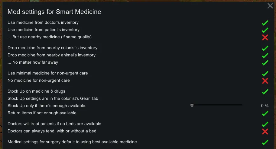 Works with [url=https://steamcommunity.com/sharedfiles/filedetails/?id=1365242717]Pharmacist[/url]. Though I don't personally use it - the features are mostly redundant now that Smart Medicine has a simple "Best for surgery" if that's good enough for you.