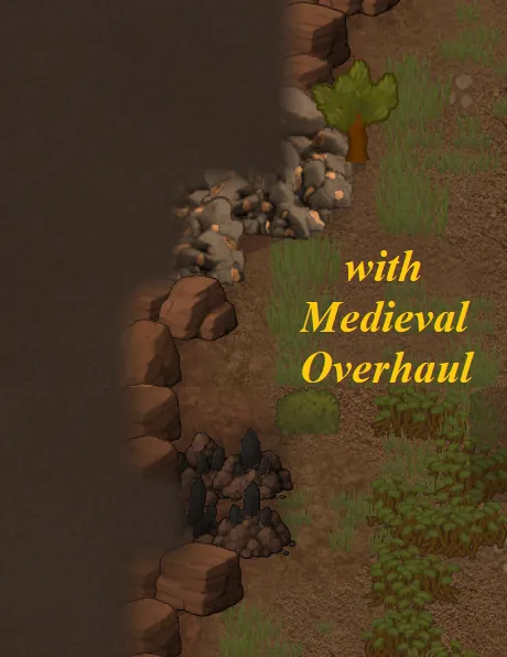 This mod changes visuals of the natural mountains so that each mountain tile is a separate rock. It was inspired by the Minerals_SK mod, which looks great, but includes very complicated mechanics, leading to mod conflicts. In my mod there is no such mechanics that adds a new rock type for the walls of rooms and tunnels cut in the mountain, so they will look the same way as the exterior mountain walls, until you smoothen them.