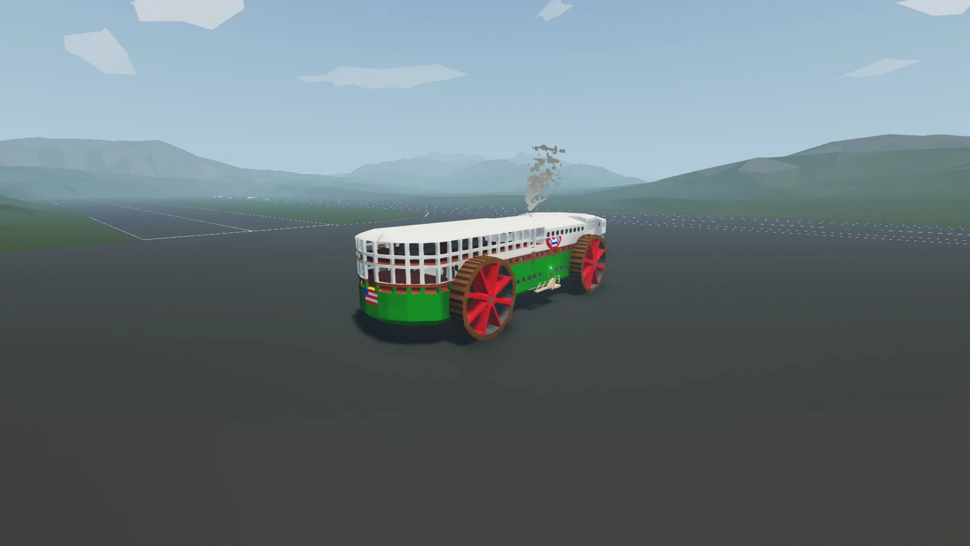 The wheels, because of the nature of Stormworks, WILL become damaged. It is only avoidable if the creation is made indestructible, however this does not impede the function of the ship. It is also rather loud at anything above ~7% throttle, be advised.