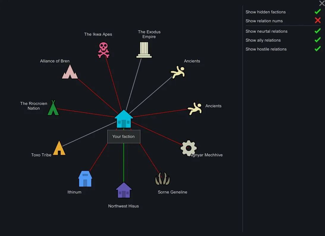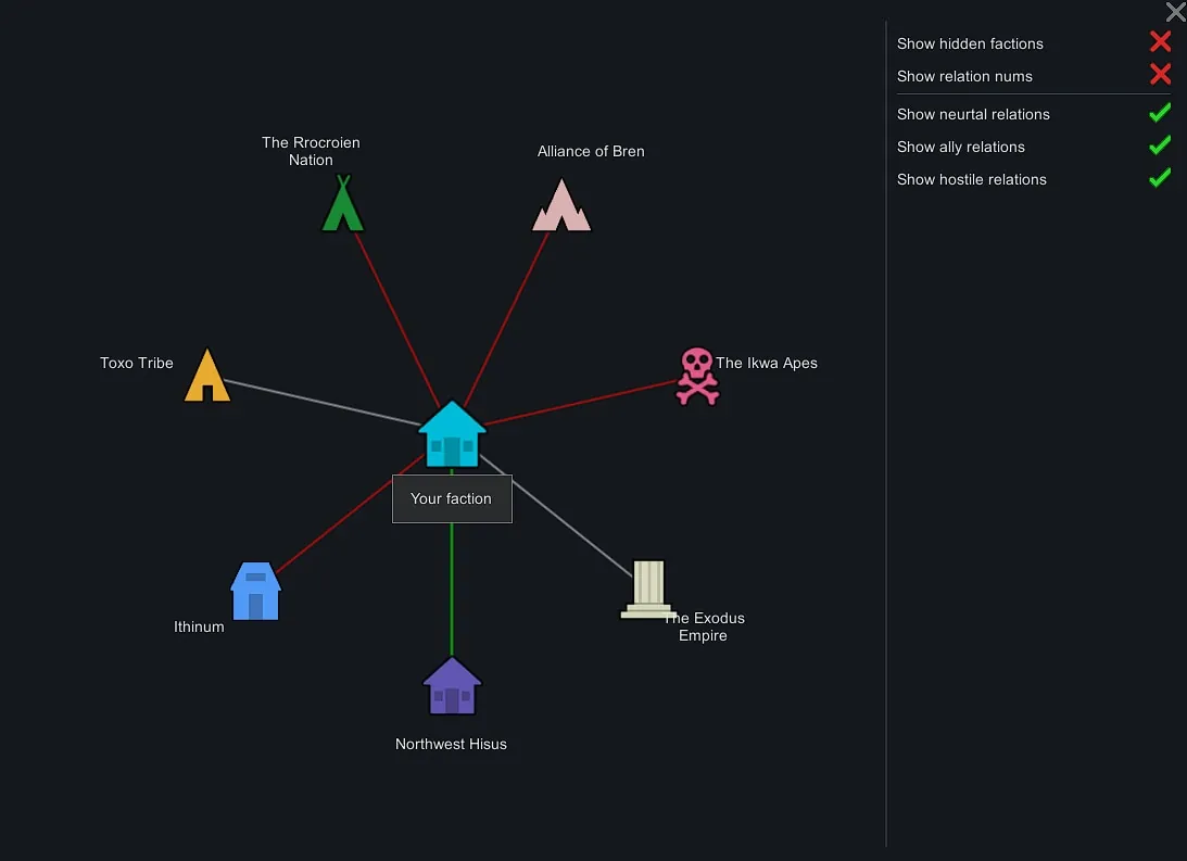 Factions are connected using colored lines, indicating the relationship of the selected faction to the factions in the circle.