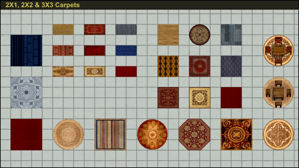 - 9 Carpets 2X1 sized, 9 2X2 and 9 3X3 sized, from Hay, Cloth or Synthread.