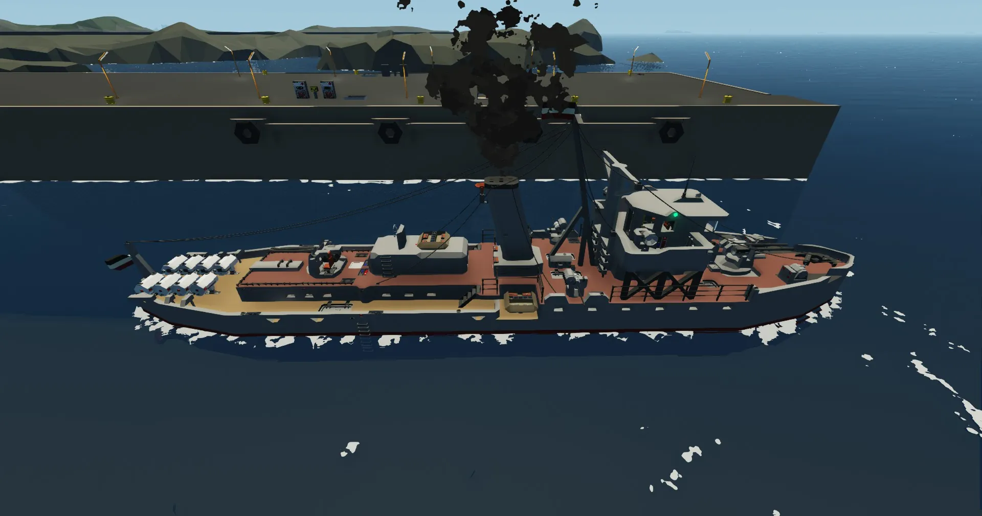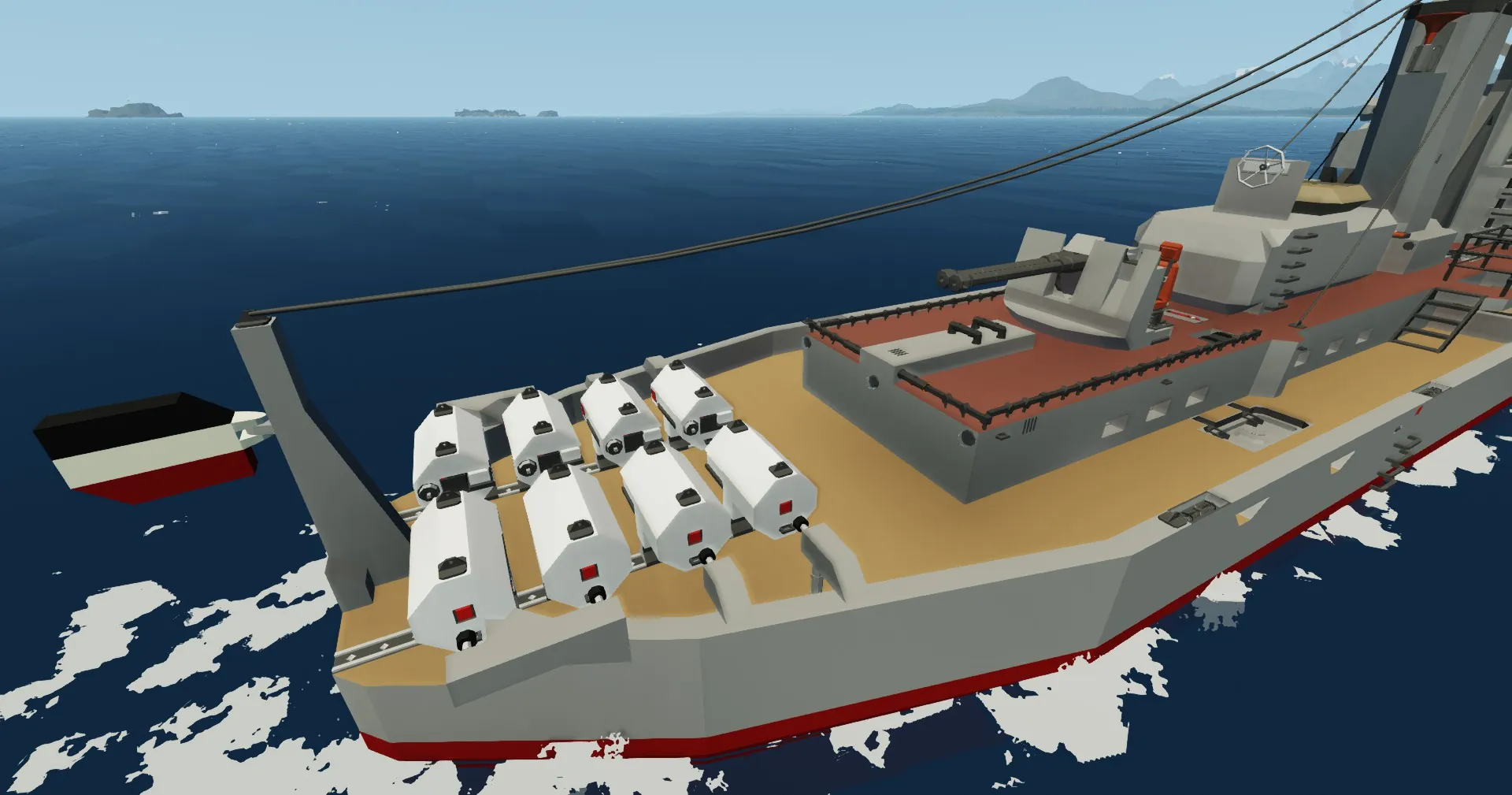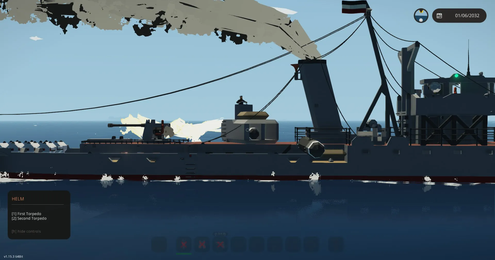 One torpedo in bow, hidden below the waterline. (launch button on bridge)