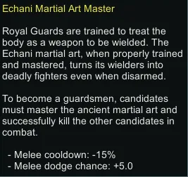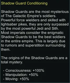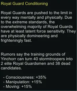 There also two "Conditioning" hediffs meant to reflect the intensive training that members of the Royal Guard undergo. Use dev tool or mods like character editor to add them to pawns of your choosing (this will be changed in future updates).