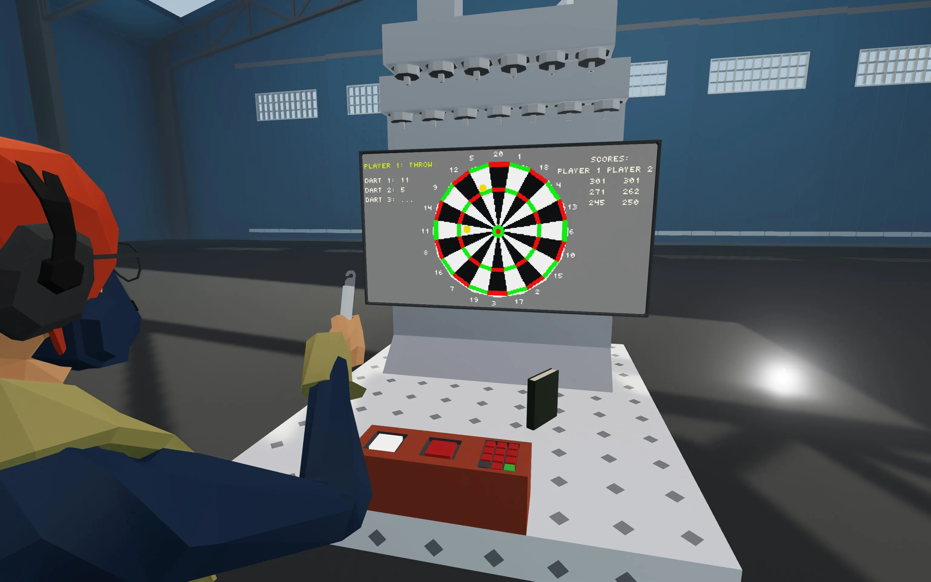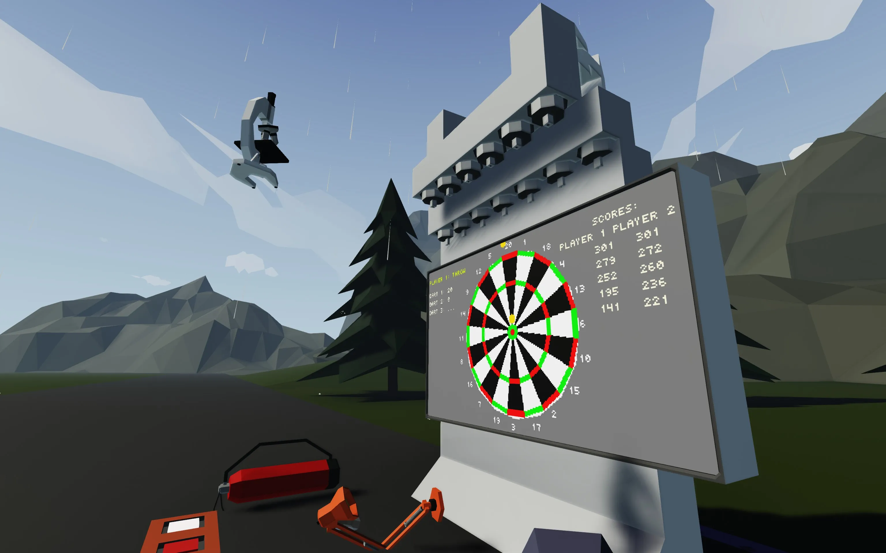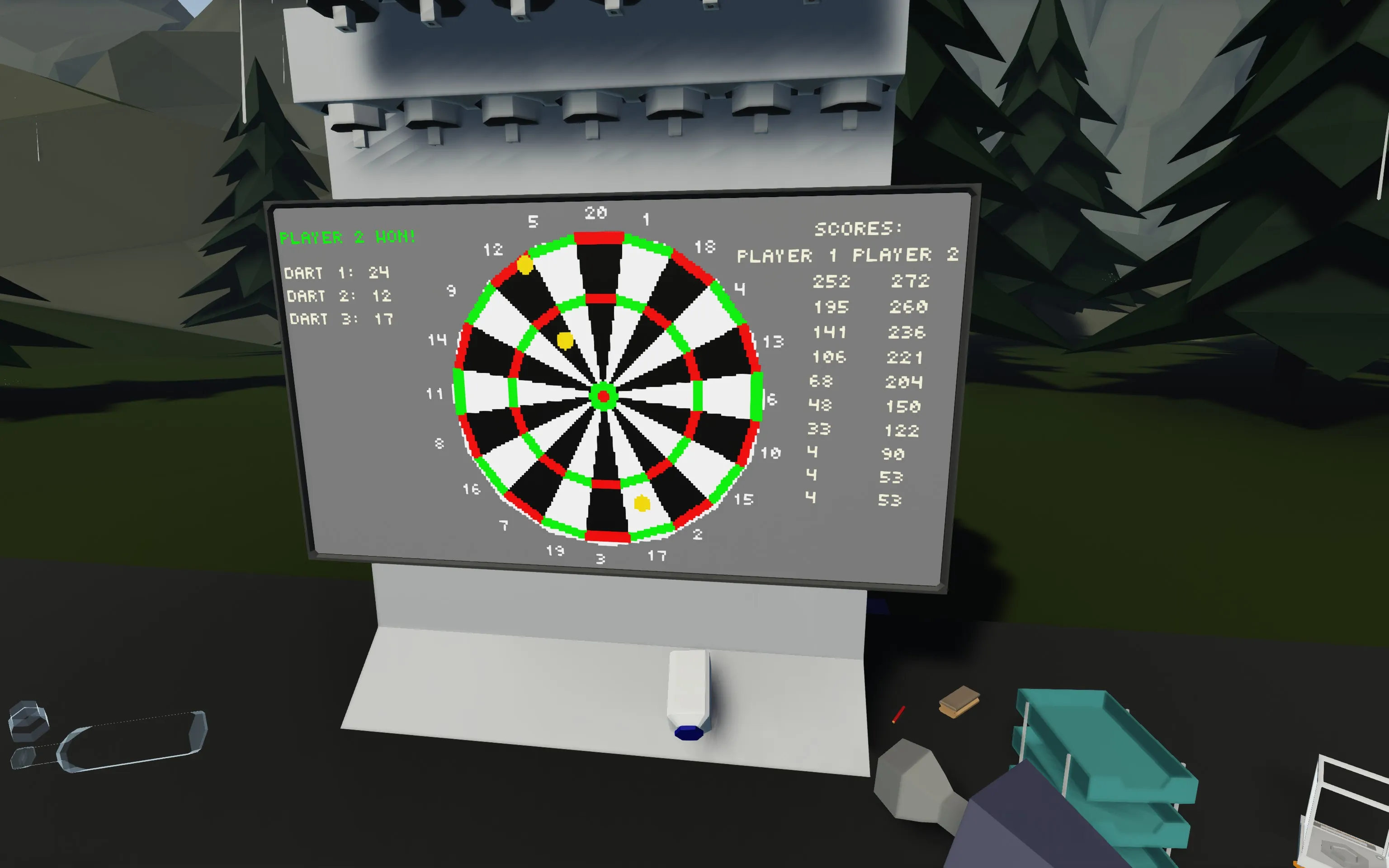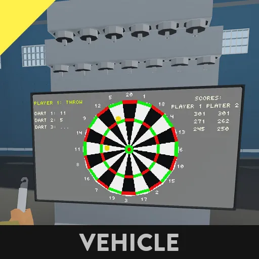 The best darts are the randomly found in-game objects such as books and flasks, since you can control the throwing force by holding Q/E. You can find them lying around inside the bases and other buildings. The smaller objects allow for more precise scoring, but anything goes. My personal favorites are mugs and bottles (yet getting score for smashing a TV into the dartboard has a nice feeling to it, too).