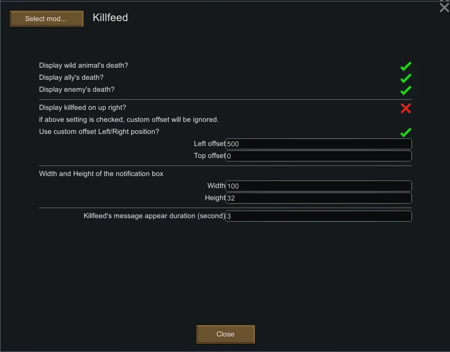 - Left offset and Top offset is use to define the kill feed position on the game screen. Default to (0,0) which is top left.