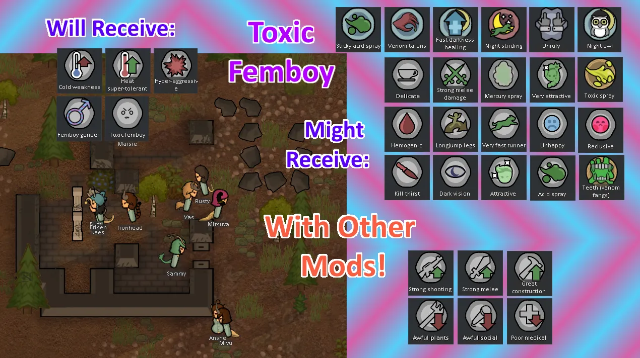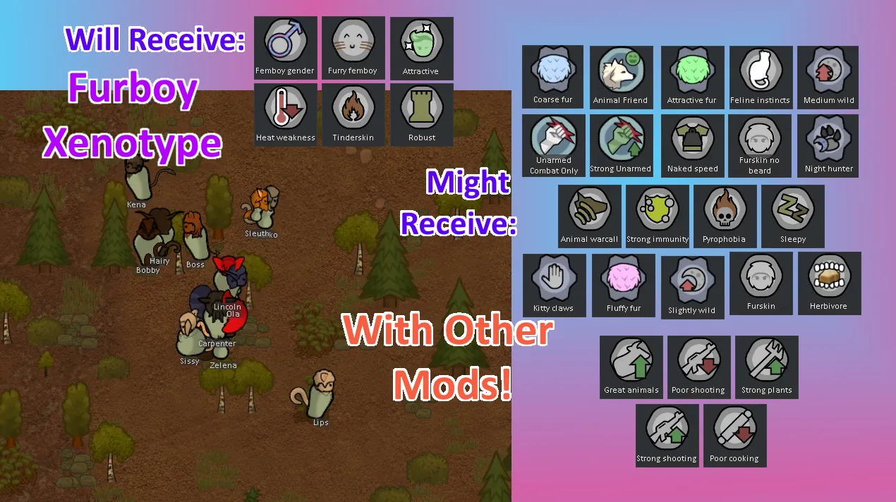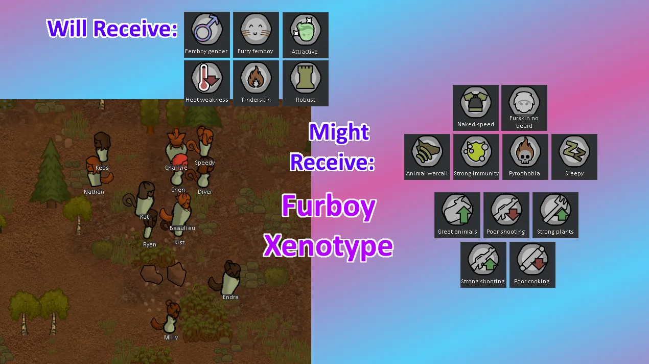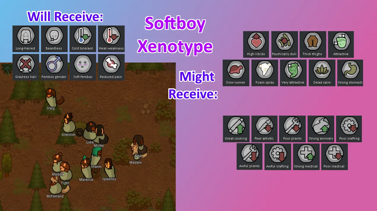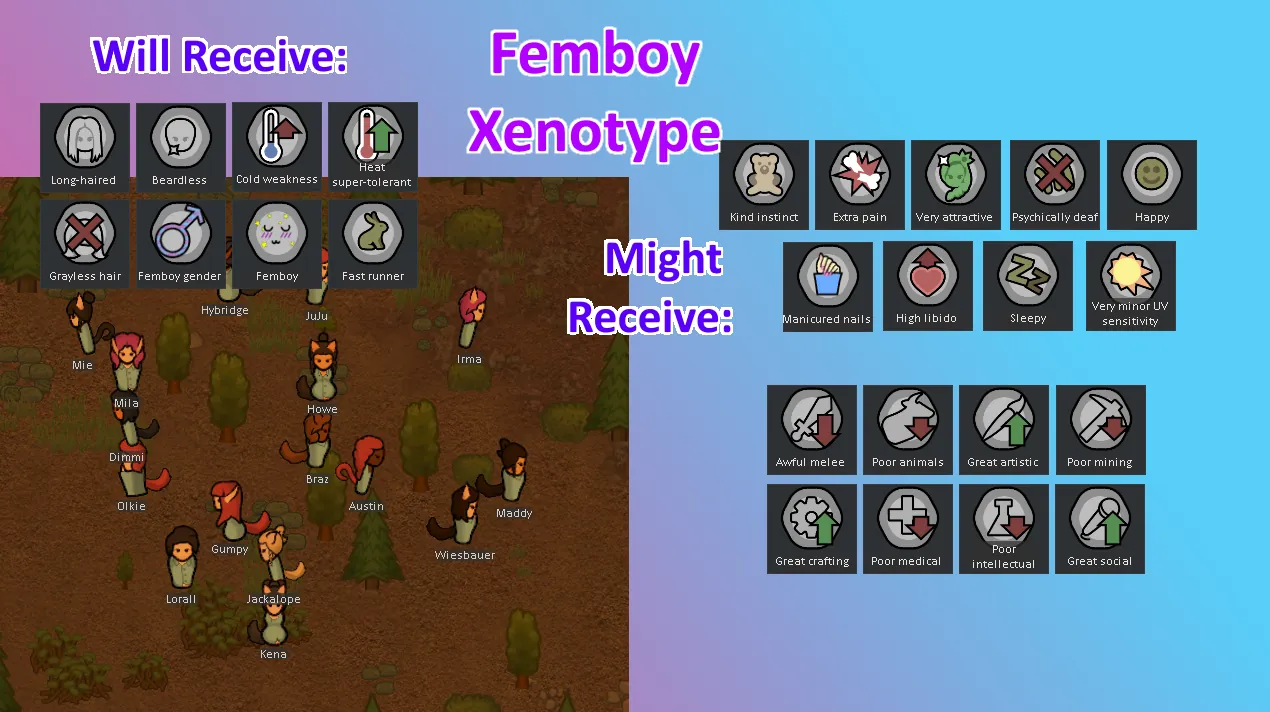 The genes that femboy xenotypes can get are not limited to only genes in this mod. Rather than creating all my own genes, this borrows a lot from other mods to reduce bloat. If you have other gene/xenotype mods present, Femboys may spawn with some genes from that mod.