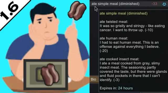 This mod combines all mood effects from ingredients (e.g human meat) and meals into one mood buff for your convenience. Enjoy! XD