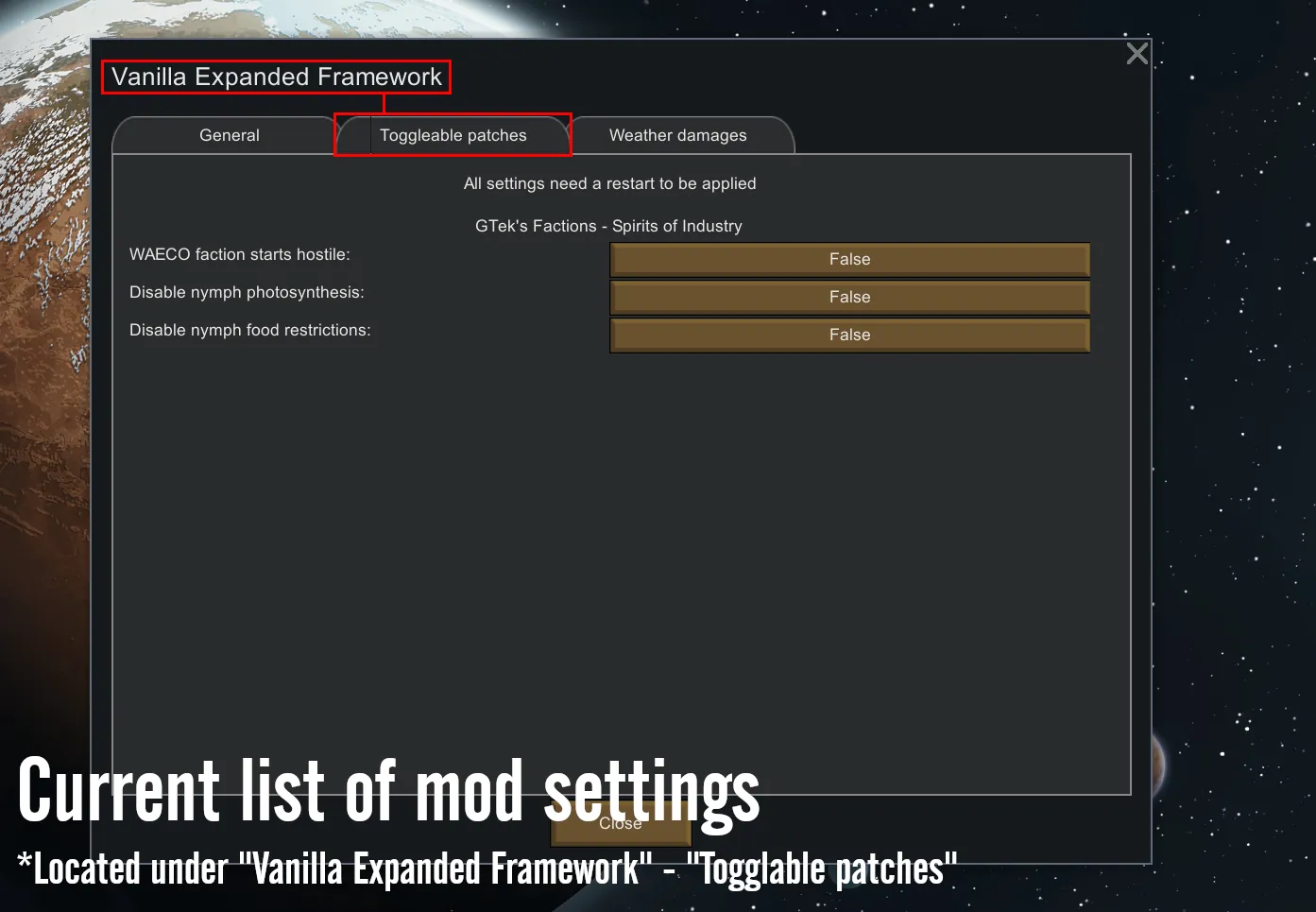 - [url=https://steamcommunity.com/sharedfiles/filedetails/?id=2023507013] Vanilla Expanded Framework [/url] (Required for certain functionality, including mod settings)