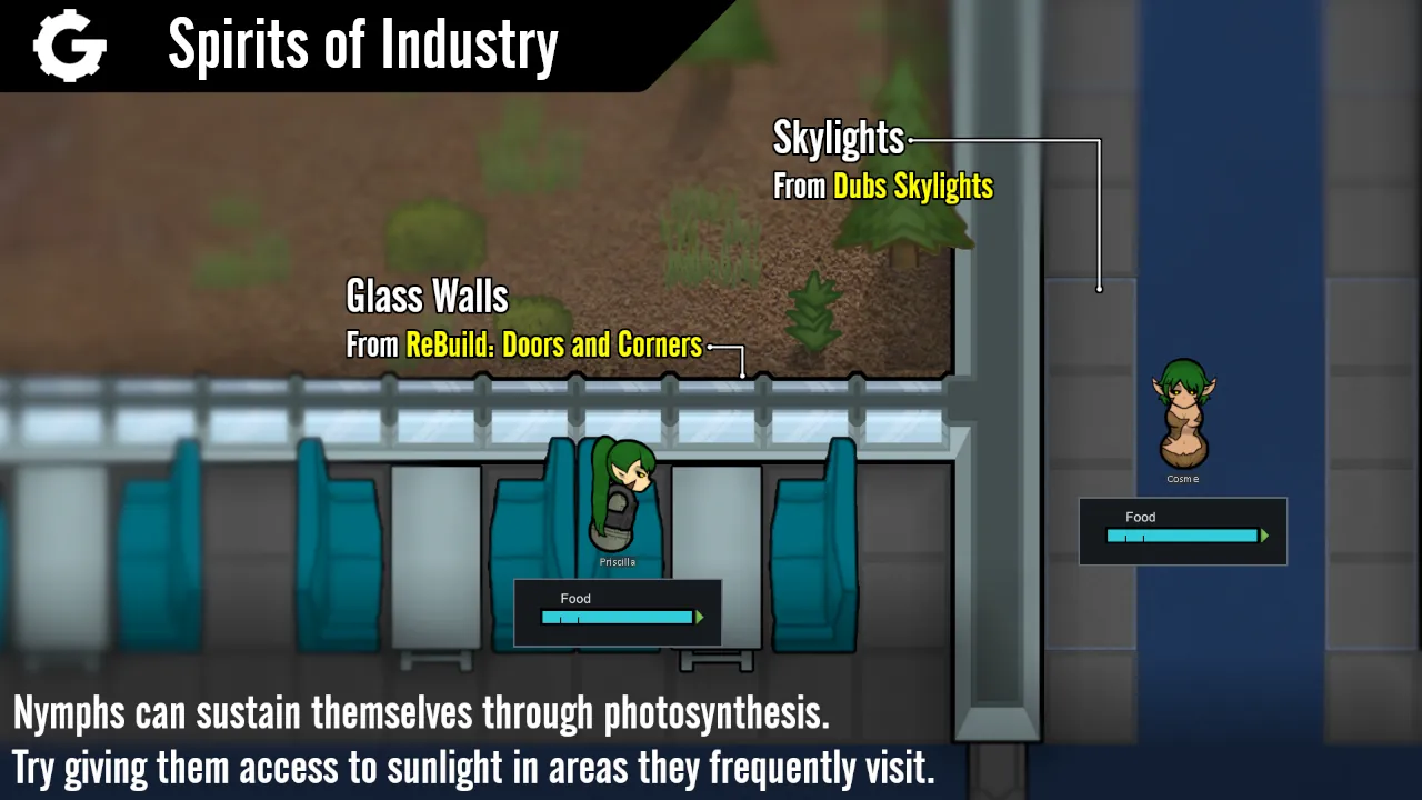 - [url=https://steamcommunity.com/sharedfiles/filedetails/?id=833899765] Dubs Skylights[/url] and/or [url=https://steamcommunity.com/sharedfiles/filedetails/?id=3262718980] Rebuild: Doors and Corners [/url] (Nymphs like sunlight. Try placing skylights or glass walls near areas they frequent to help them stay nourished.)