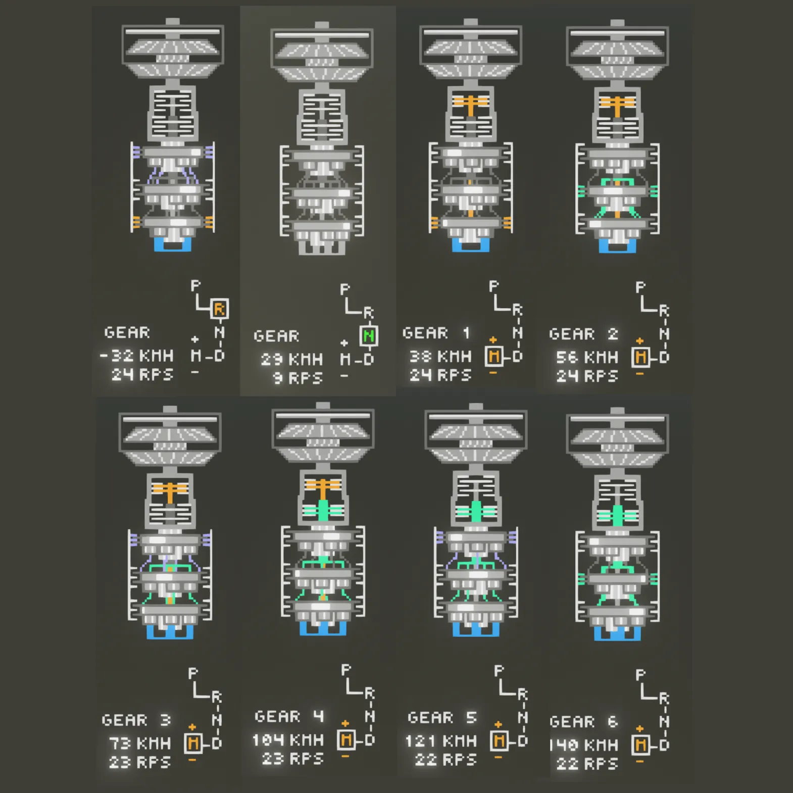 This is a microcomputer and sample vehicle equipped with a automatic transmission(3 planetary gearsets) with gear animation.
