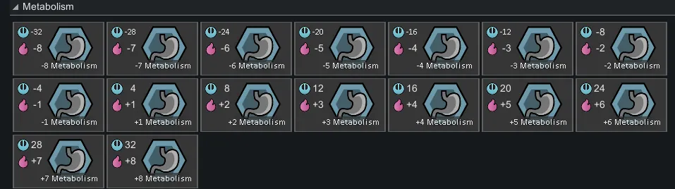 2 metabolism gain/cost per level -> will be changed to 1 in next update.