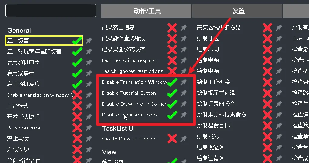 注意:添加的这些DebugSetting的默认值都是false,需安装本mod后自行启用,并且随时都可以进行更改而不用重启