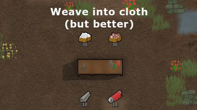 Here's where it started getting out of hand, though. Once you've got cotton bolls, you can add chemfuel to them to make raw synthread (once you've done some research), which can be woven into, you guessed it, synthread. (You can turn it off in options if you want)