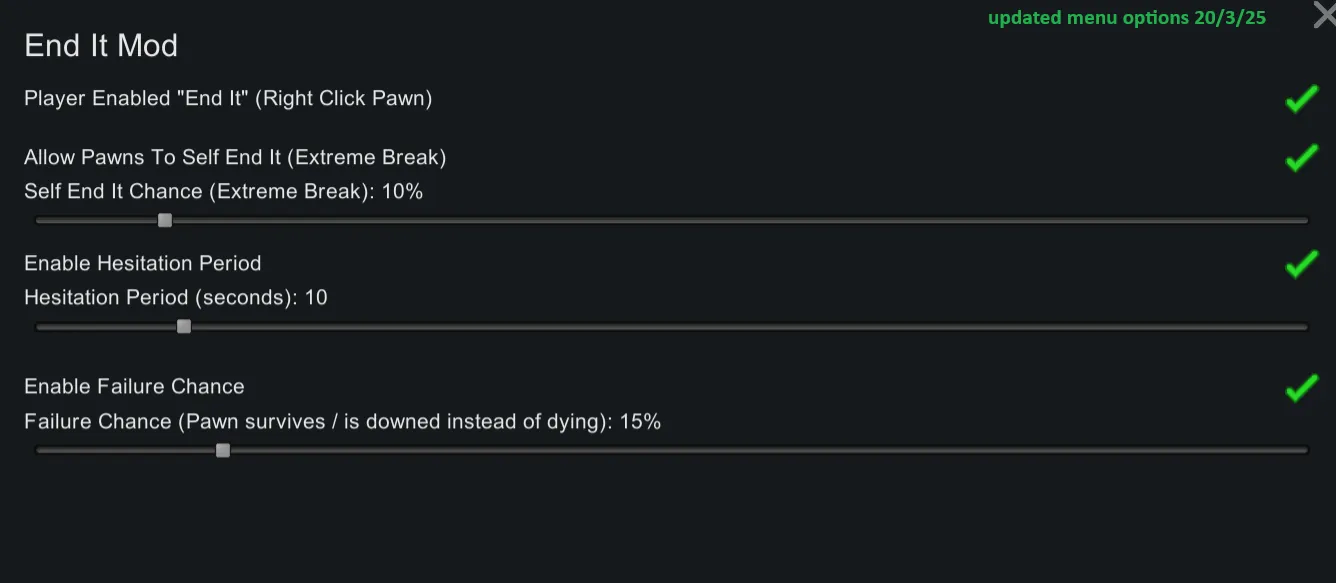 🔹 Percentage Chance – The extreme breakdown "End it"chance now properly calculates and applies based on user settings. 100% will guarantee that the pawn will end it as where a low value of 10% carries a lower risk.