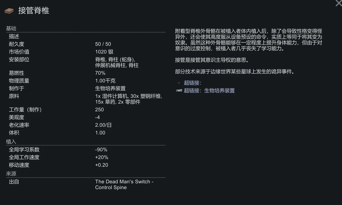 This item features crossover content with the Celestial Axis series mods: it includes a recolor version of the Celestial Axis series armor. Designed specifically for individuals implanted with the Control Spine, the armor is manufactured using DMS materials—incorporating exoskeleton technology that enables the wearer to use certain weapons intended for mechanized soldiers. It is not recommended for use by mechanoids or ordinary humans.Special thanks to the Polarisblob series authors LuneFox and Vaniat, 1.6 continuation author Pos 4/5, and CE patch contributor 星宫萤雪.