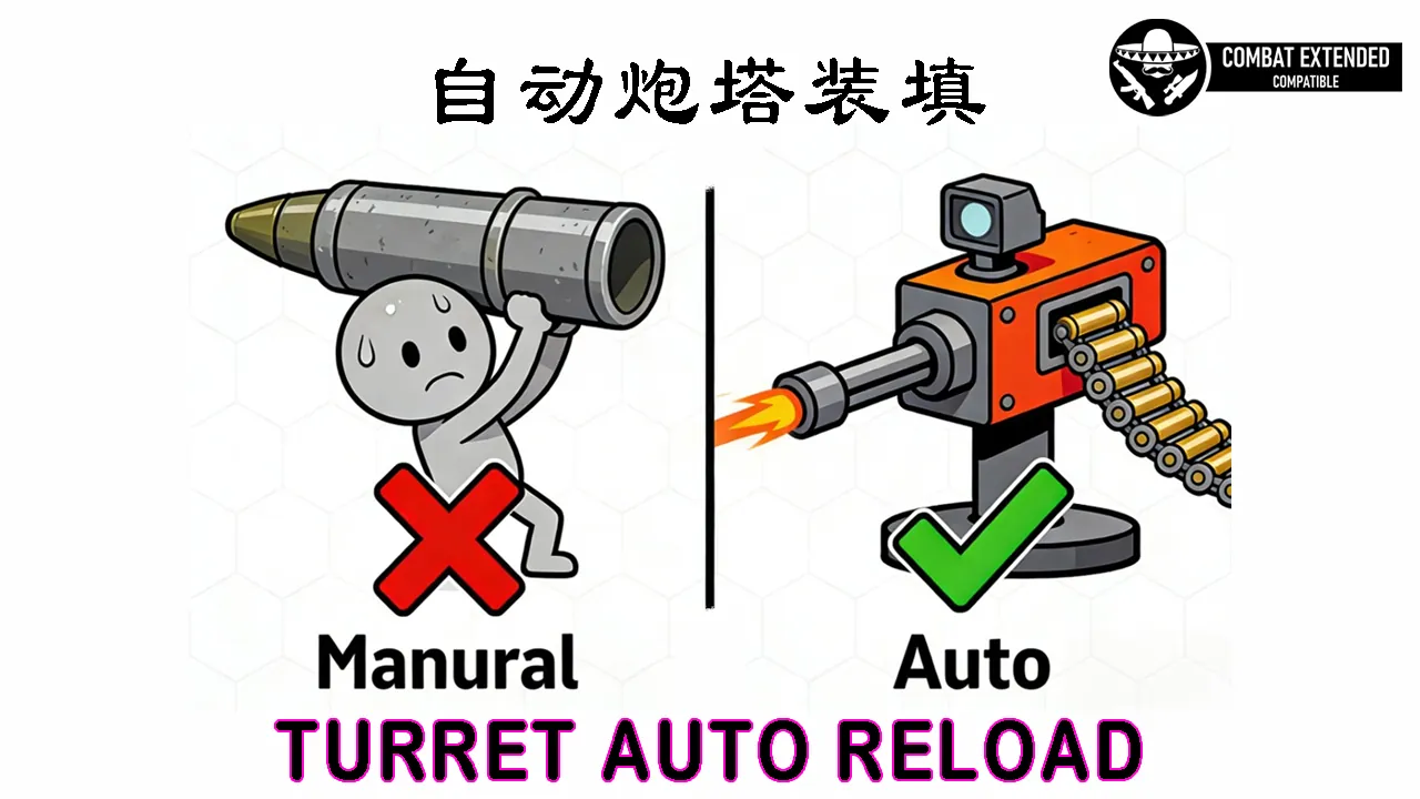 [*] [b]Combat Extended (CE) Integration[/b]: Tailored for complex battlefield requirements. It seamlessly interfaces with CE's ammunition system, automatically identifying the correct shell types and managing ammunition swaps. Selecting a different ammo type on the turret will trigger an automatic unloading of old stock and immediate restock of the new selection.