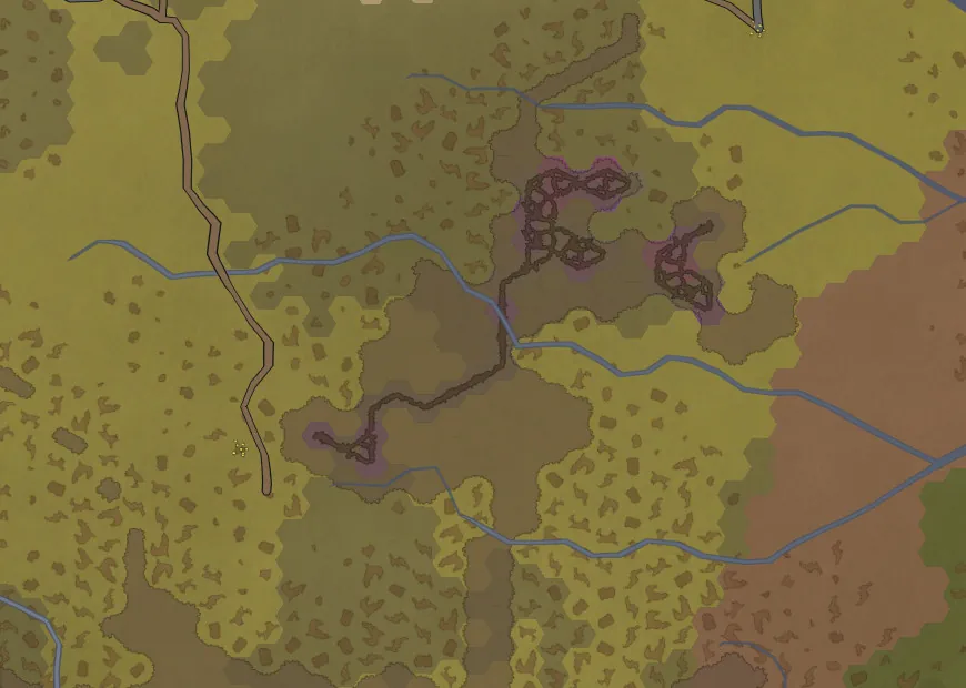 An underground cave system interconnecting many sinkholes of various sizes. The sinkholes are of natural origin, the cave tunnels not so much. Gigant insectoids dug these tunnels over years and now live in them. Don't get tempted by the peaceful look of the overgrown sinkholes, this area is dangerous!