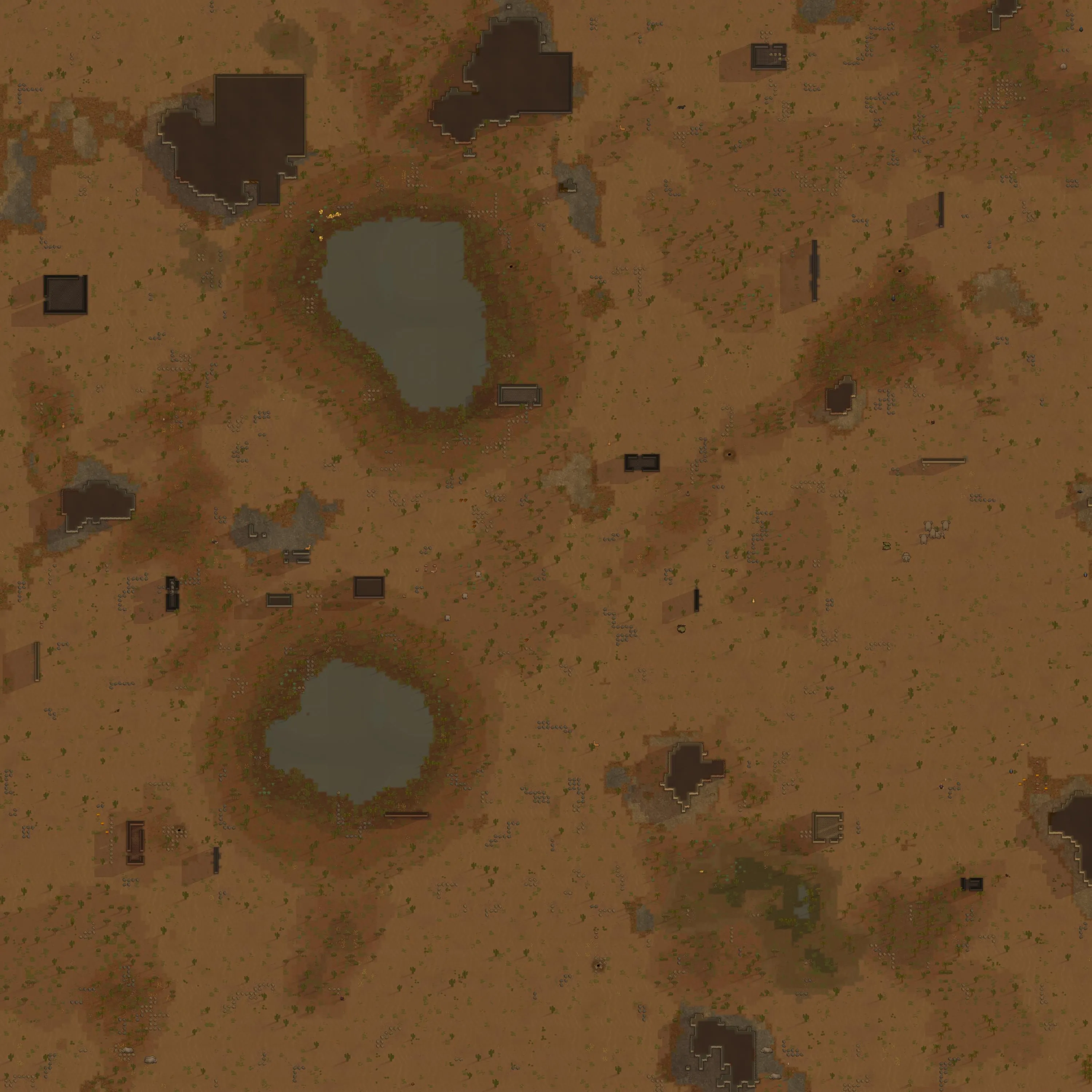 An oasis somewhere in the seemingly endless deserts. Plants grow around water spots and animals gather near them to drink and search for a shaded place.