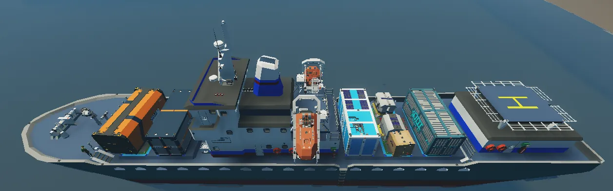 Has Helicopter landing pad at the rear of the ship for transportation of crews or rescue services.