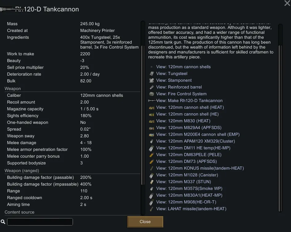 To better market their tankcannon, the designers and manufacturers borrowed the name of the renowned Rh120 cannon from RheinMetal. In reality, the design of this cannon was more influenced by the CTG tank gun of the CV90120 light tank. Ultimately, this cannon was not selected by the colonial fleet for mass production as a standard weapon. Although it was lighter, offered better accuracy, and had a wider range of functional ammunition, its cost was significantly higher than that of the 125mm tank gun. The production of this cannon has long been discontinued, but the wealth of information left behind by the designers and manufacturers is sufficient for skilled craftsmen to recreate this artillery piece.