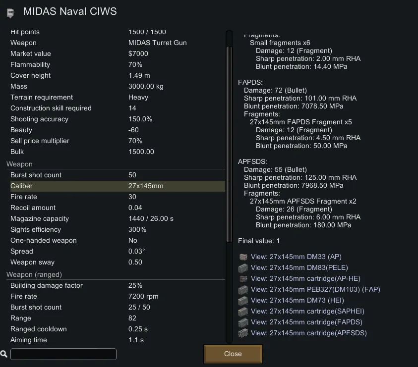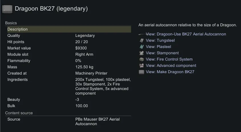 The non-Dragoon variant of this autocannon in the environment wtihout DMS has no bodysize restrictions, potentially granting balance enthusiasts excessive combat power. And the weapon stats might be slightly higher. MIDAS and MLG27 feature CIWS functionality released by Combat Extended.