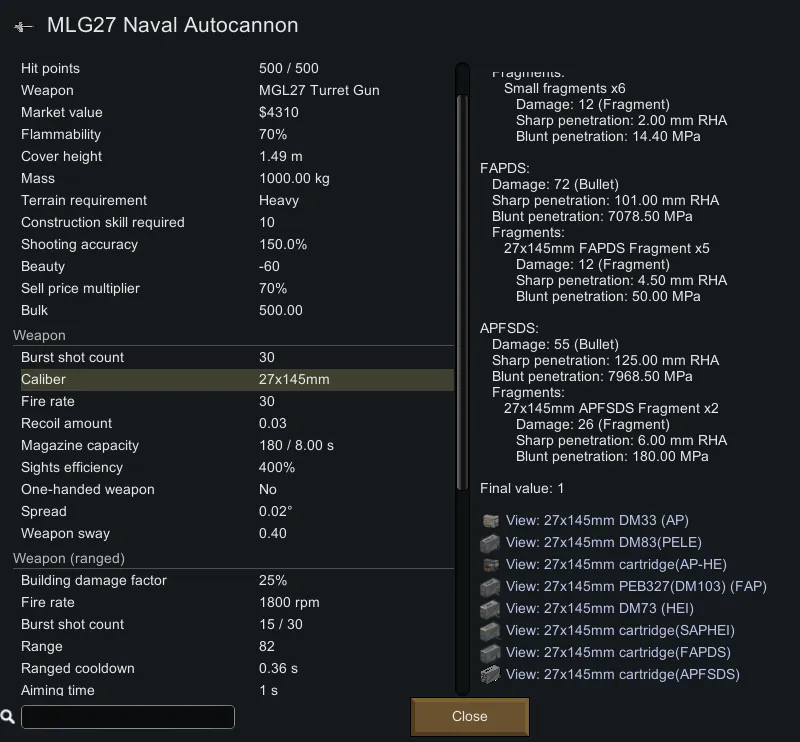 The BK27 utilizes 27x145mm ammunition, and the available types of ammunition for this weapon include: DM33 (AP), DM73 (HEI), PEB327 (DM103) (FAP), DM83(PELE), FAPDS, SAPHEI, AP-HE,APFSDS, all of which are new ammunition types added by this Mod. For some of the ammunition types, I was unable to find real-world designations.