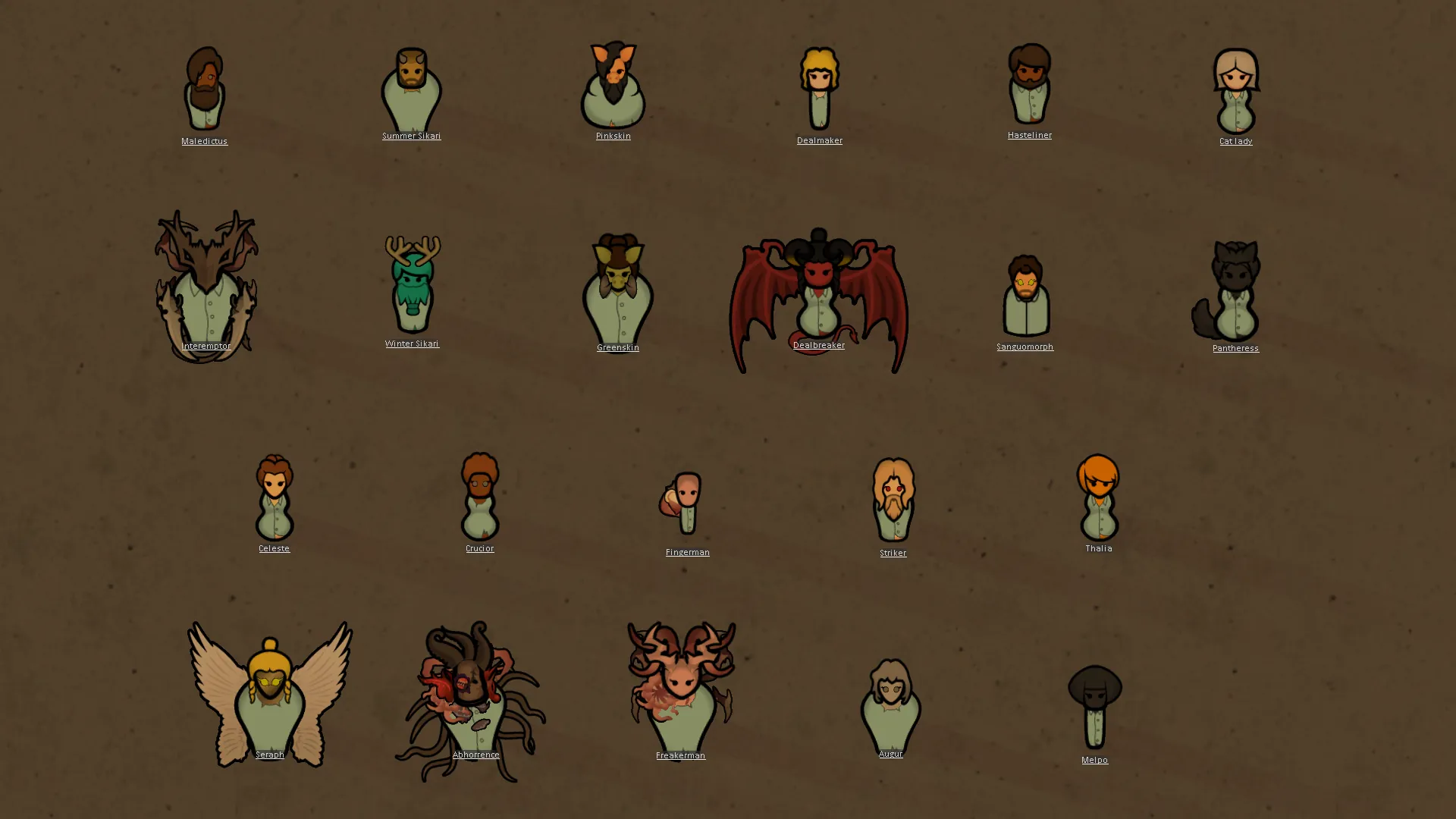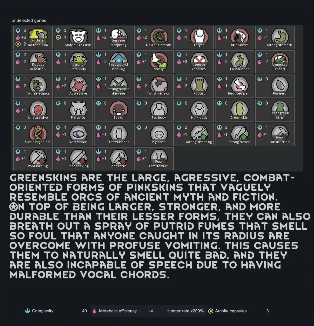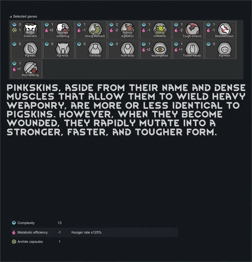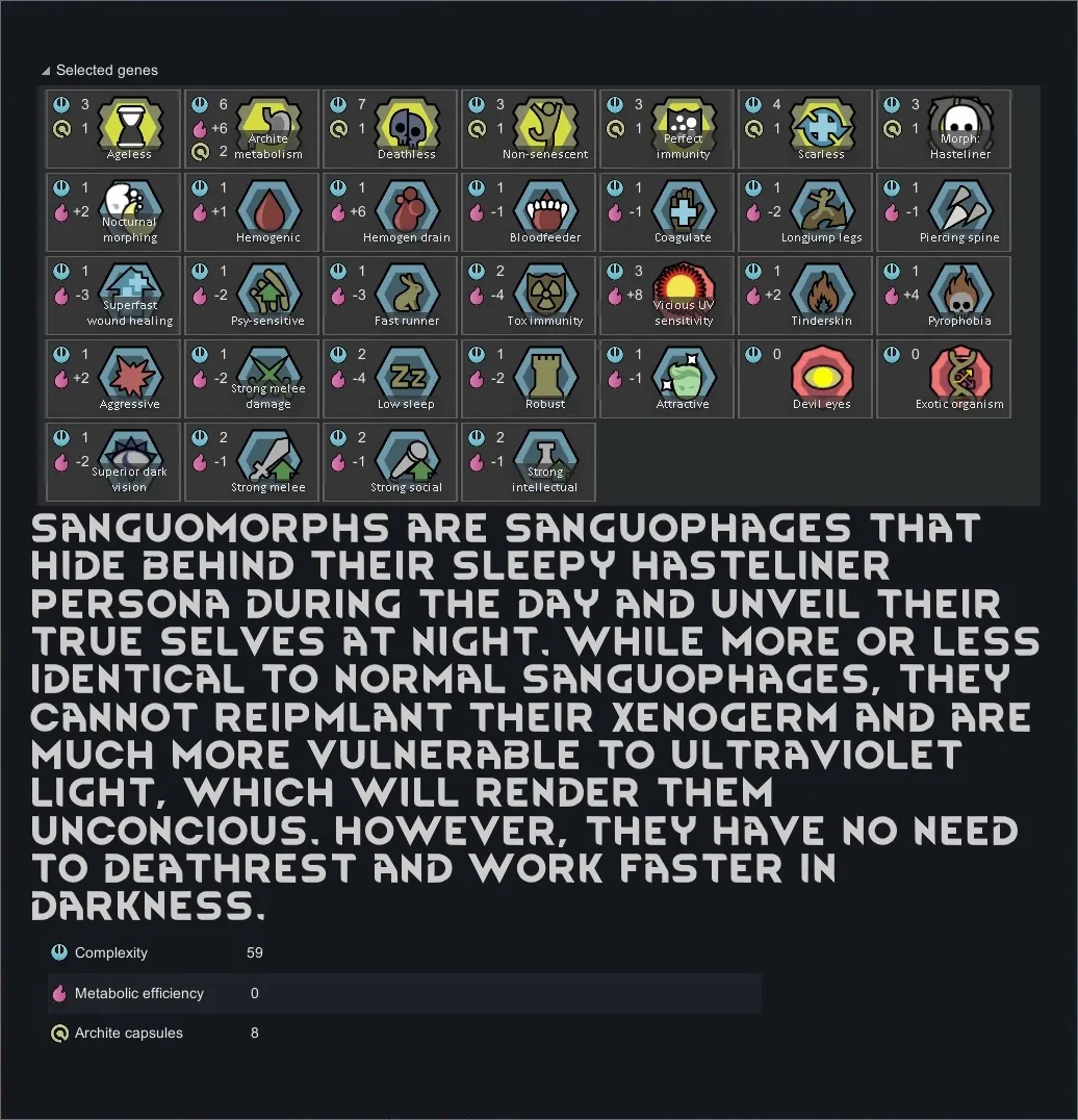 [*] To make full use of the xenotypes' features, do not start a game with the Winter Sikari, Greenskin, Sanguomorph, Pantheress or Interemptor xenotypes, and do not add them to a pawn mid-game.