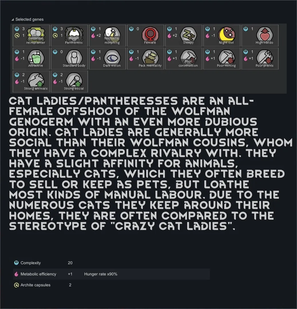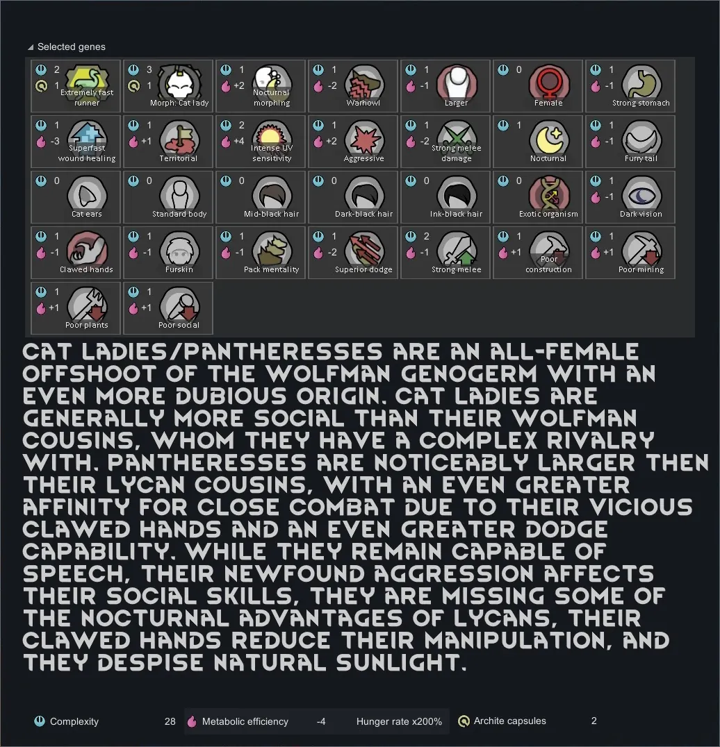 [*] The xenotypes are all germlines due to a bug in the Lycanthrope mod that this depends on; normal xenogenes would constantly be duplicated when the pawn transforms back to their first form.